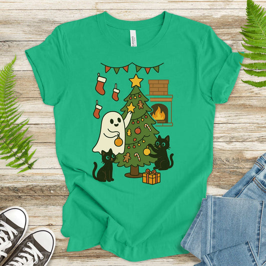 Ghost & Black Cats Christmas T-Shirt – Haunted Holiday Tree Decorating Tee