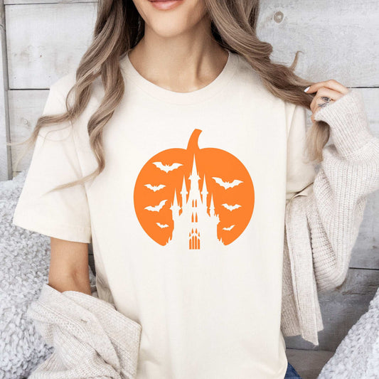 Haunted Pumpkin Castle T-Shirt – Gothic Halloween Bat & Spooky Vibes Tee