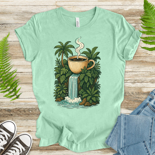 Jungle Coffee Waterfall T-Shirt – Nature Lover & Caffeine Dream Tee