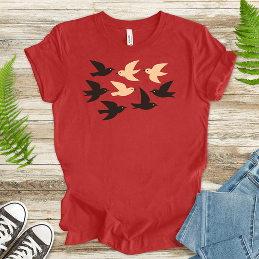 Minimalist Birds T-Shirt – Retro Black & Beige Flock for Nature Lovers