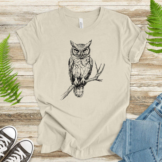Owl on a Branch Sketch T-Shirt – Black and White Art