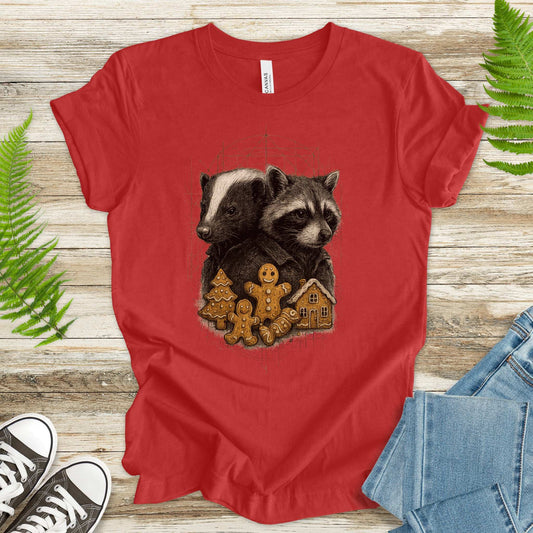 Skunk & Raccoon Christmas T-Shirt – Gingerbread Mischief & Forest Charm