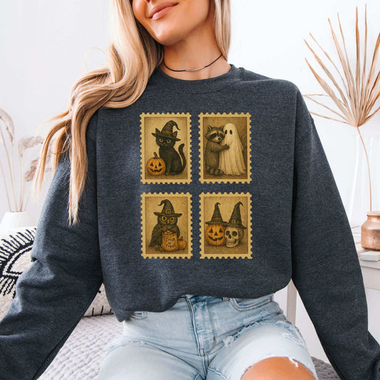 Halloween Stamps Sweatshirt – Vintage Cat, Raccoon, Owl & Pumpkin Magic