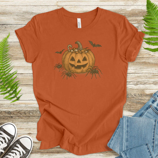 Candy Pumpkin Halloween T-Shirt – Vintage Spiders & Bats Graphic