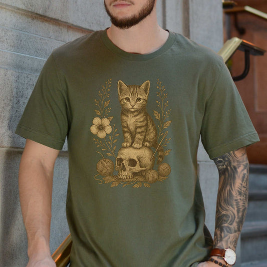 Gothic Kitten & Skull T-Shirt – Vintage Halloween Cat Floral Design