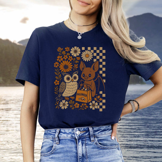 Halloween Owl & Bat T-Shirt – Cute Forest Friends in Retro Trick-or-Treat