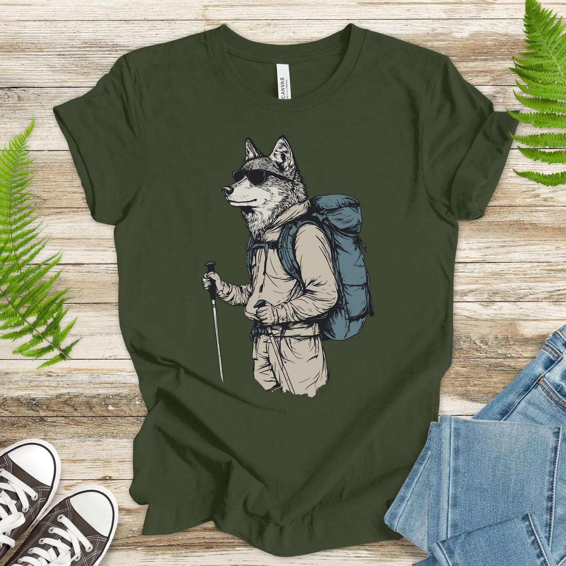 A bold design featuring a wolf in full hiking gear—sunglasses, backpack, and trekking poles—ready to conquer the trails. Perfect for outdoor lovers!