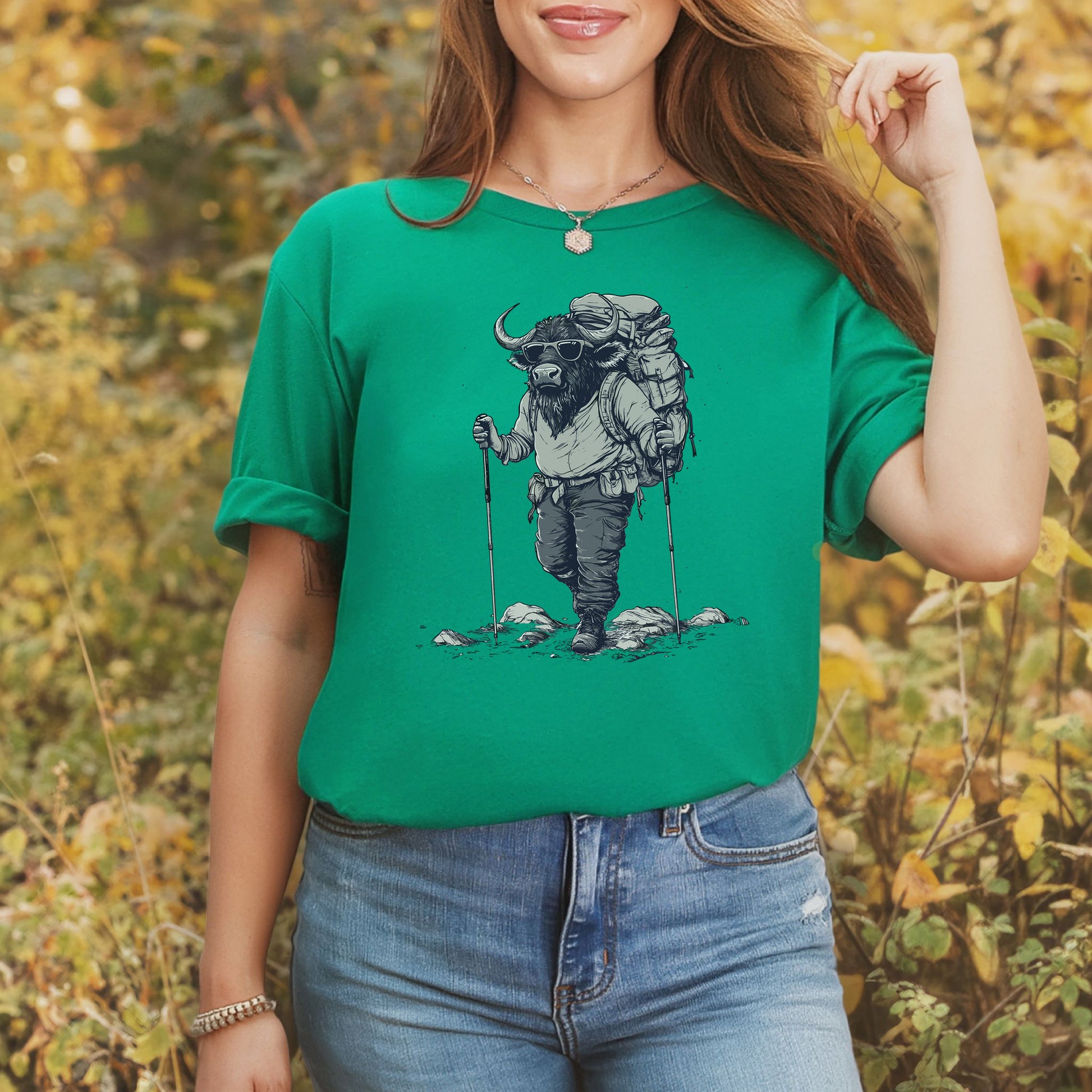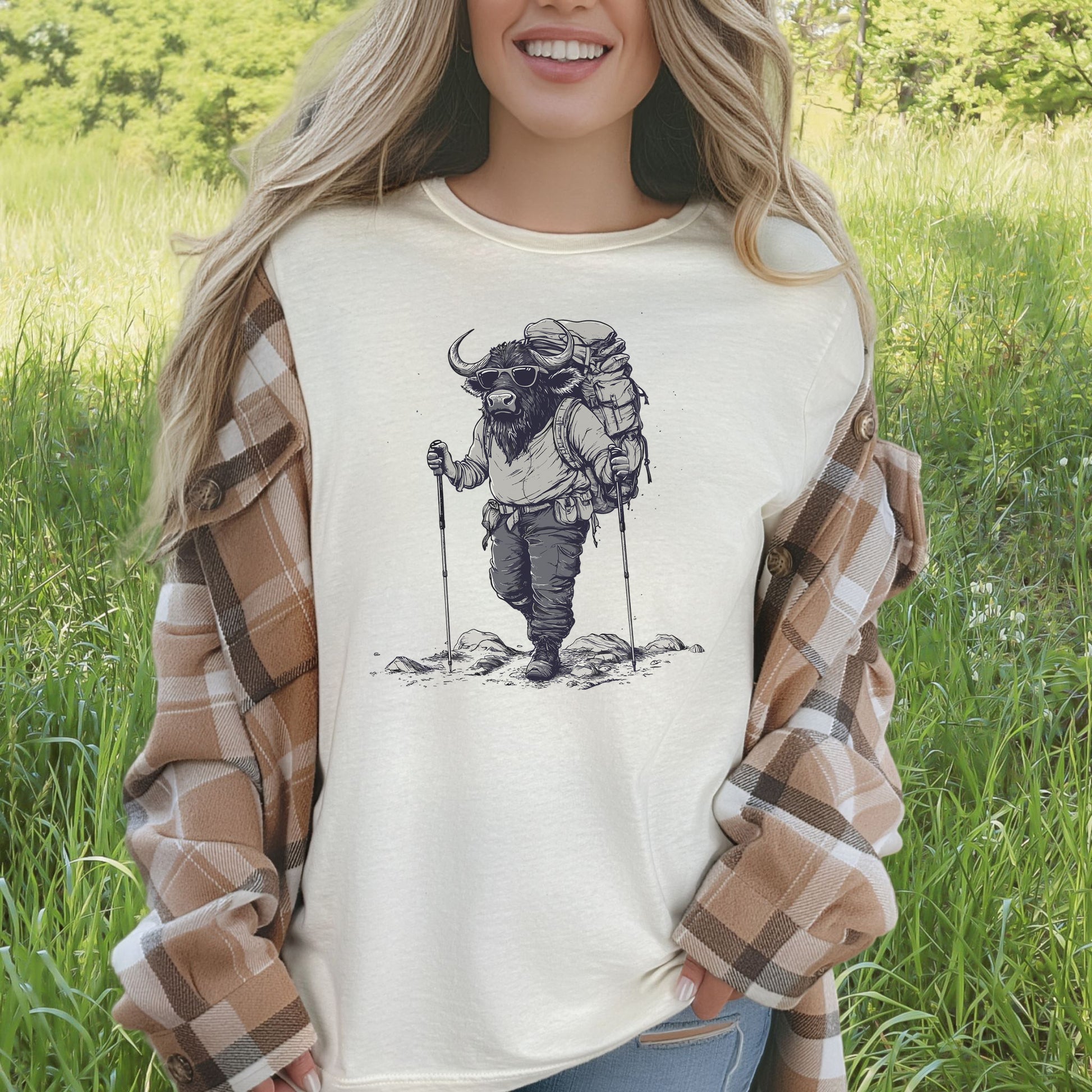 Ever seen a buffalo hit the trails? This rugged explorer is suited up with backpack and trekking poles, ready for a wild hiking journey. Perfect for outdoor lovers with a bold spirit!