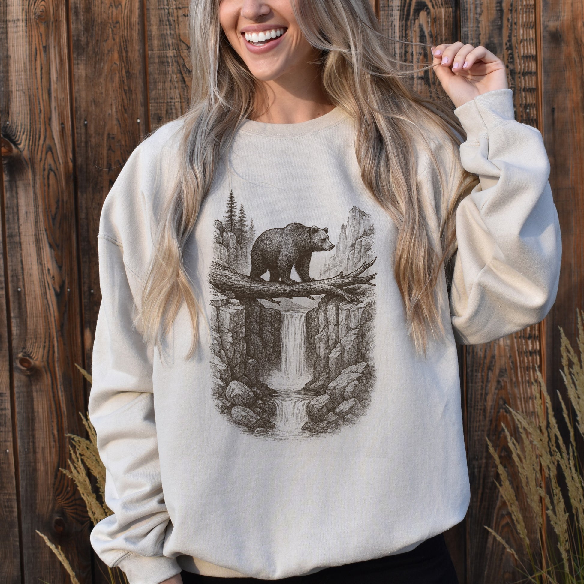 Bear Crossing Waterfall Sweatshirt – Vintage Wilderness Sketch Gift