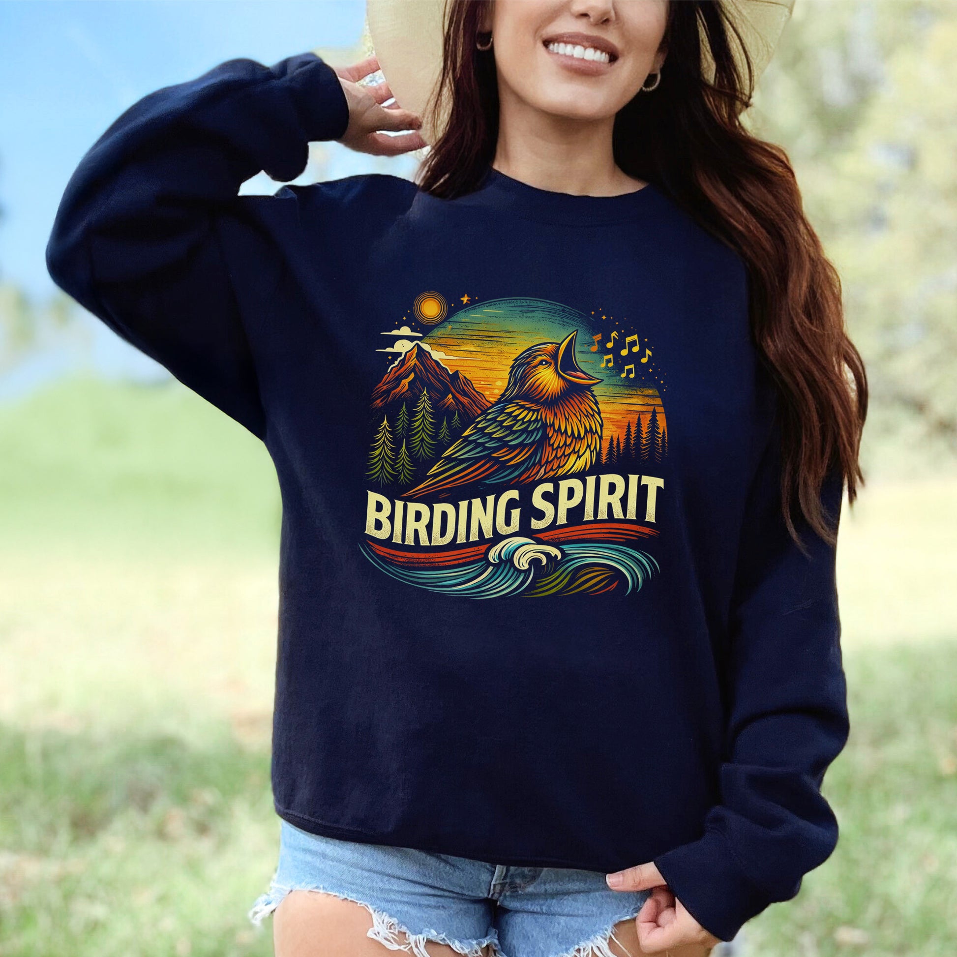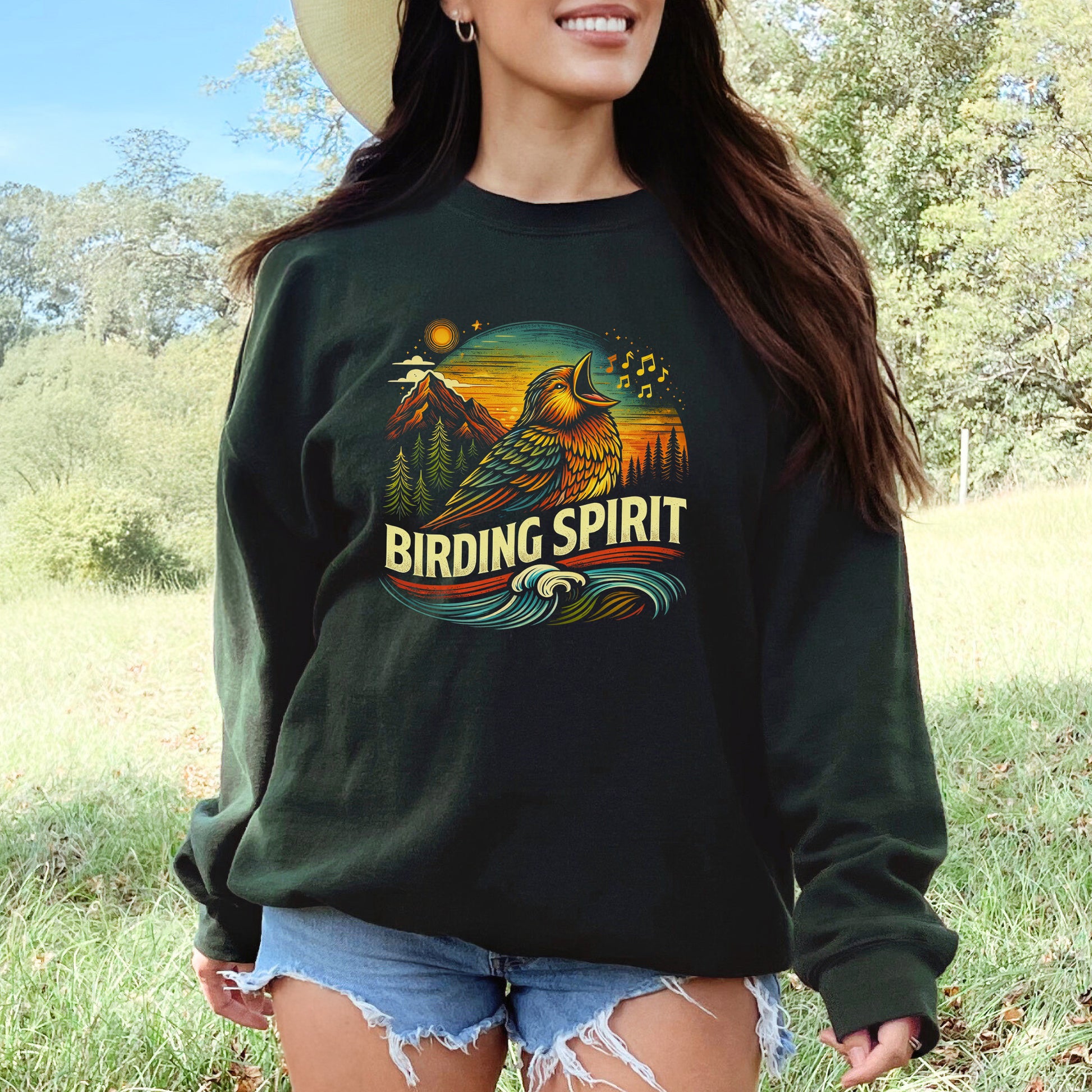 Let your wild side sing with this vibrant “Birding Spirit” sweatshirt—a bold celebration of color, melody, and mountain magic. Featuring a beautifully illustrated singing bird framed by glowing sunset hues, rugged peaks, tall pines, and flowing waves, this cozy layer blends nature, music, and adventure into one radiant design.