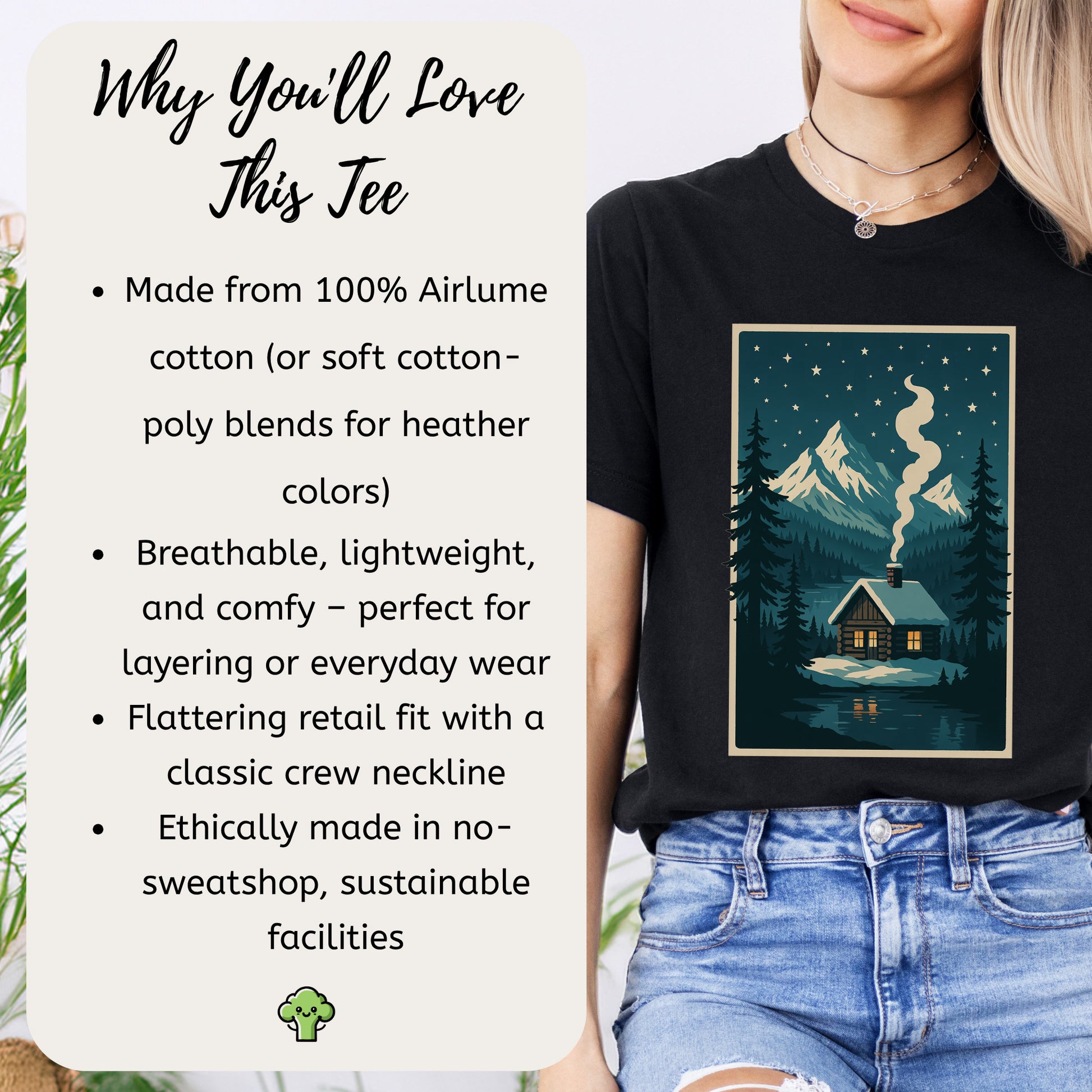 Wrap yourself in Cozy Cabin Christmas vibes with this peaceful tee featuring a glowing log cabin, snowy mountains, and a sky full of wishes. It’s like wearing a winter postcard from your dream holiday retreat—no packing required.