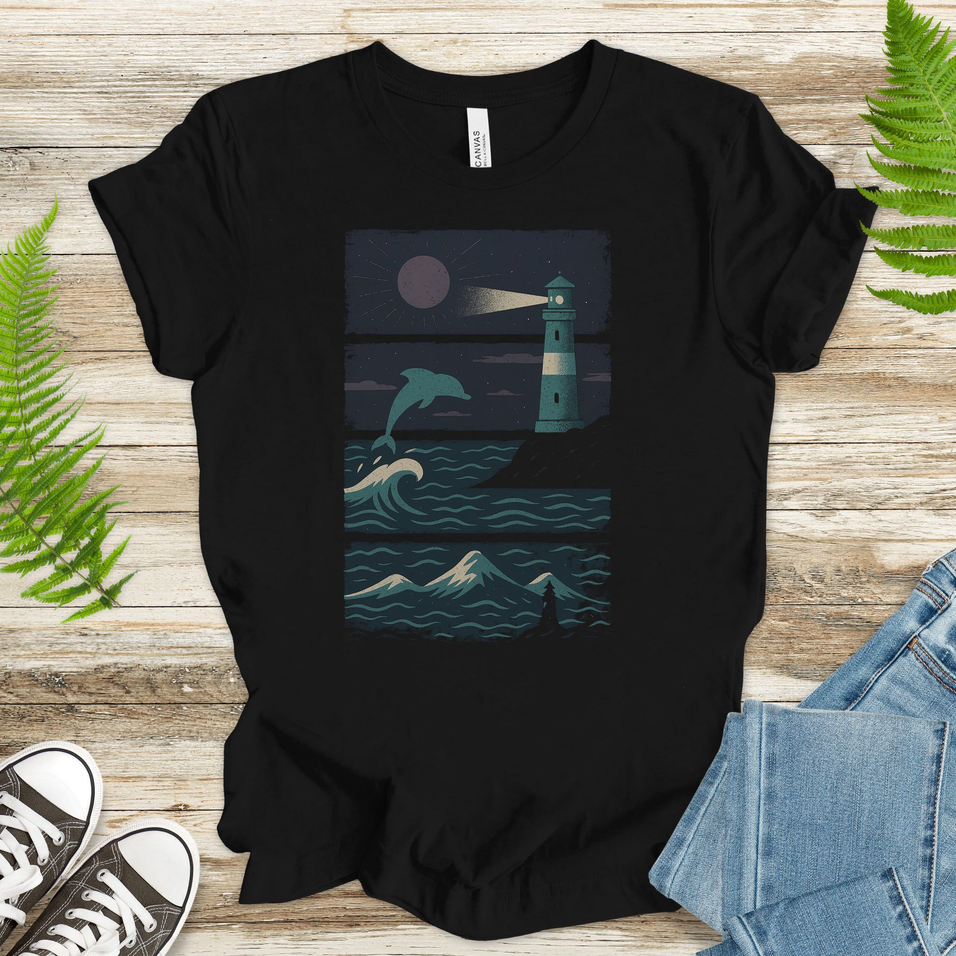 Dolphin & Lighthouse Night Scene T-Shirt – Vintage Ocean Lover Tee
