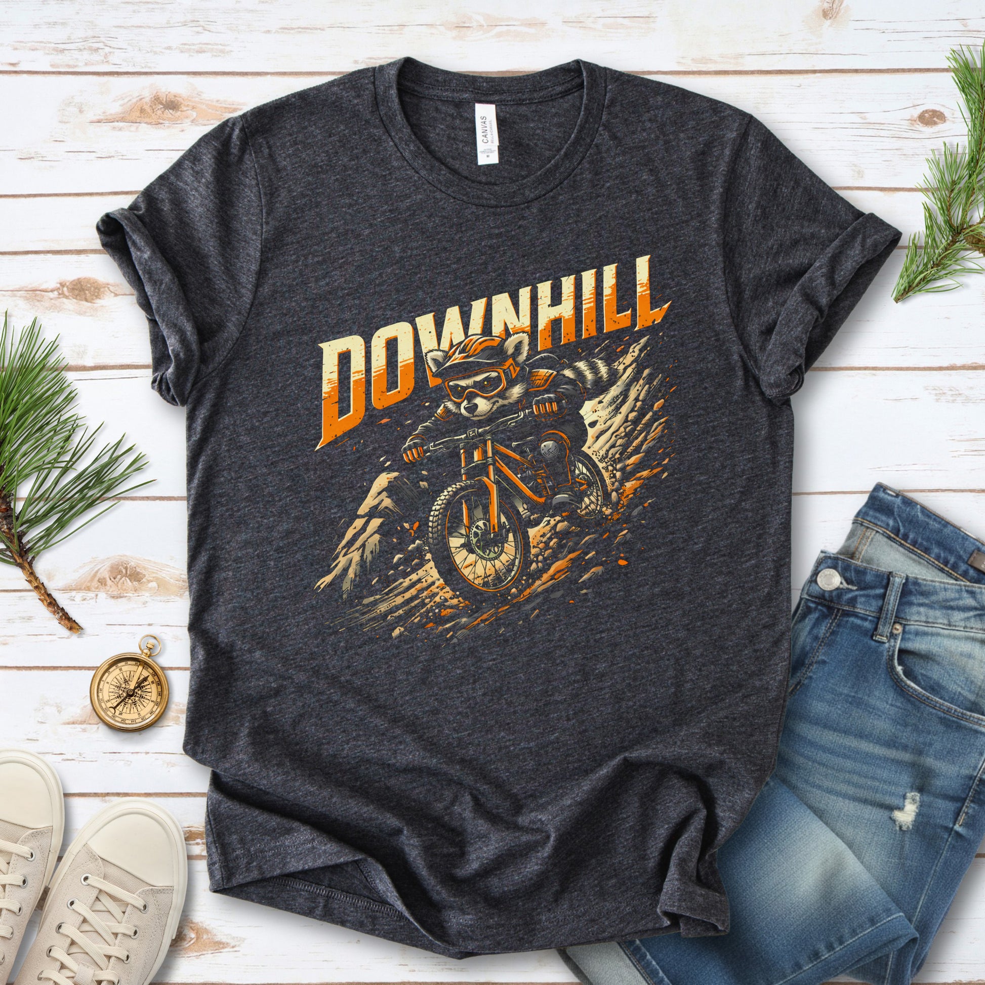 Charge into pure trail chaos with this wild “Downhill” tee, where a fearless raccoon rockets down the mountain on a beefy bike. It’s playful, gritty, and made for riders who crave that fast, dusty, full-send feeling only a steep descent can deliver.