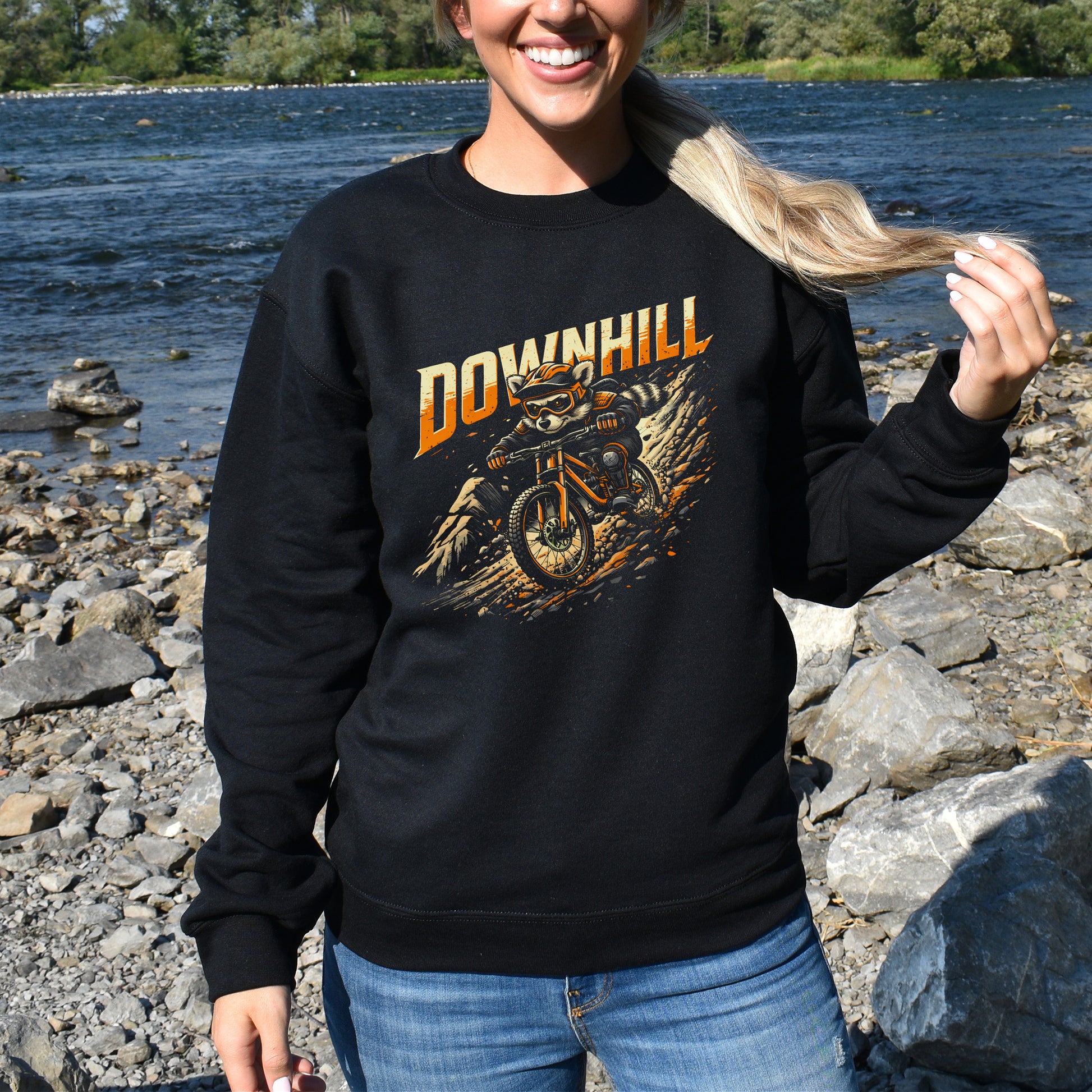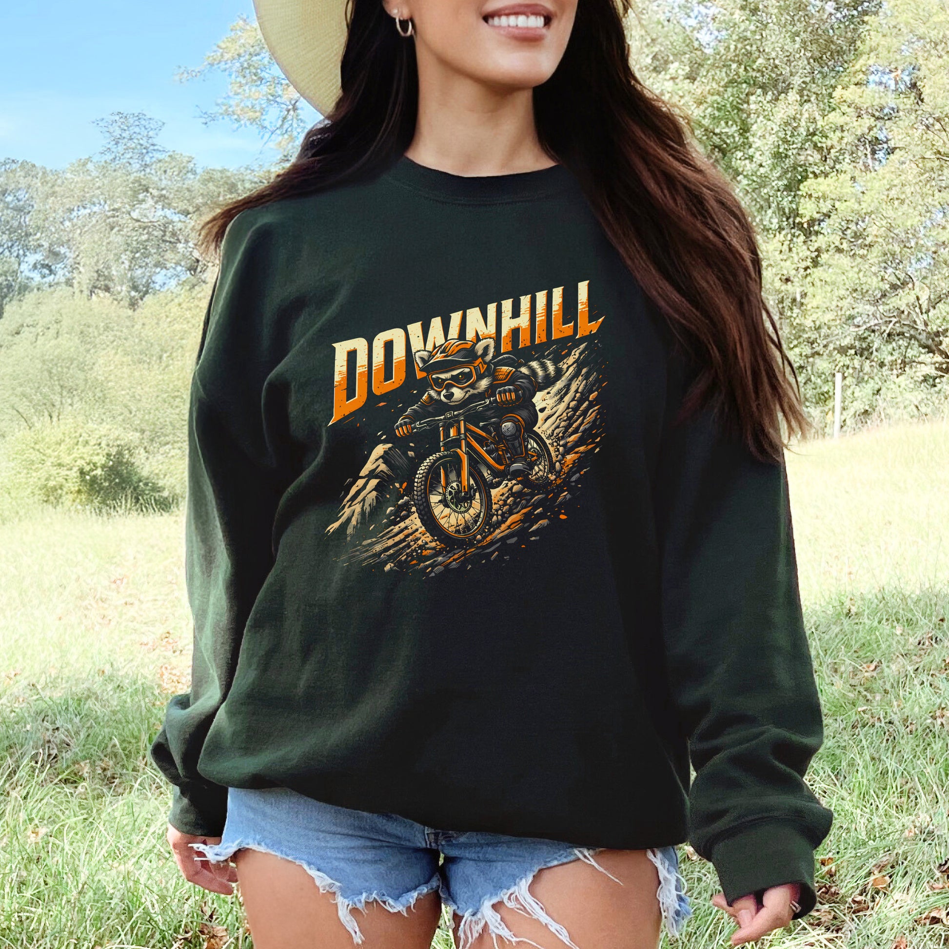 Charge into pure trail chaos with this wild “Downhill” sweatshirt, where a fearless raccoon rockets down the mountain on a beefy bike. Playful, gritty, and packed with full-send energy, this cozy layer is made for riders who crave that fast, dusty rush only a steep descent can deliver.