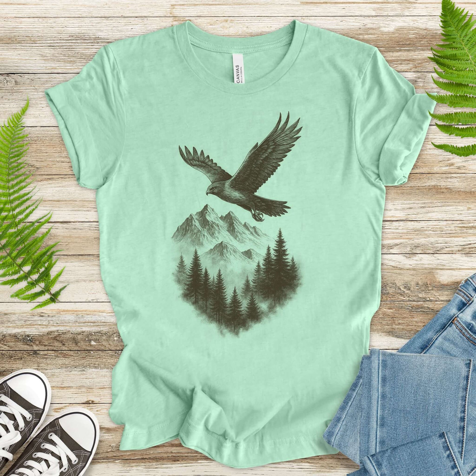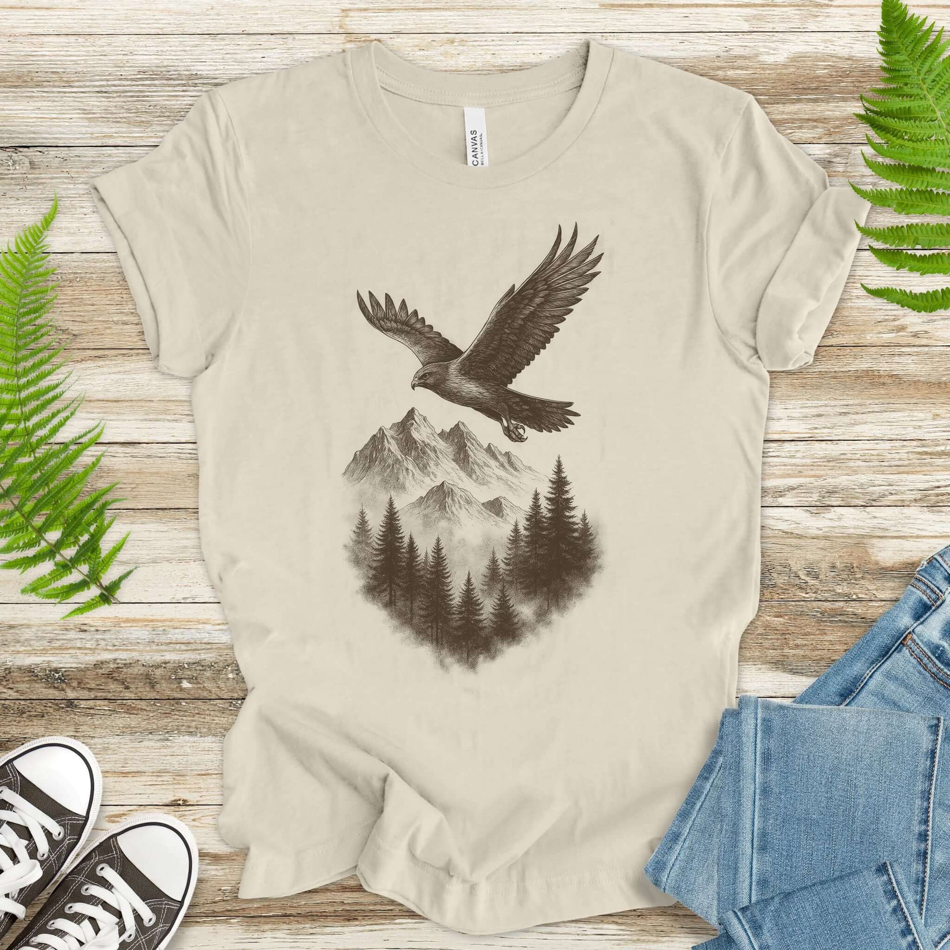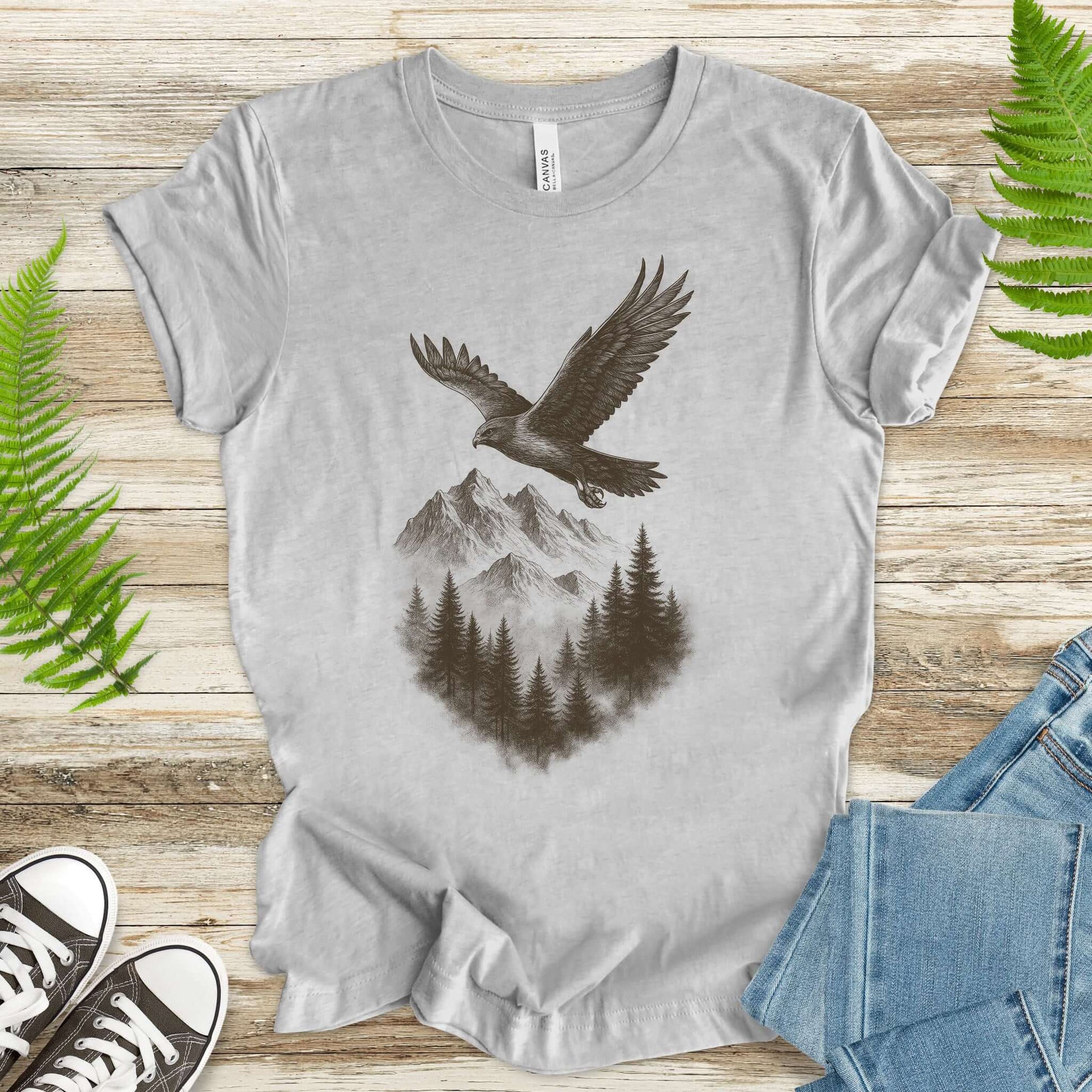 Eagle Over Mountains T-Shirt – Vintage Wilderness Spirit Animal Sketch