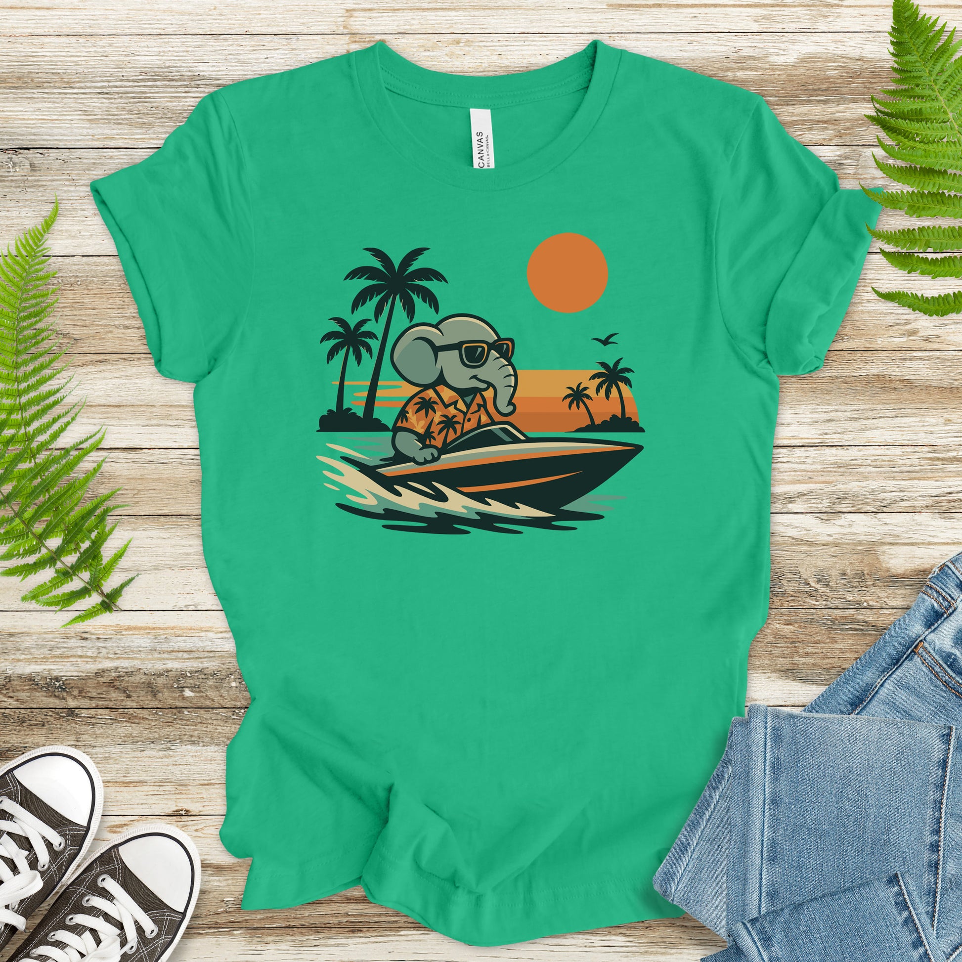 When an elephant trades the savanna for the shoreline, you get pure summer magic. This cool grey gent cruises in a Hawaiian shirt, shades on, slicing through tropical waters under a blazing sunset. Perfect for boaters, beach loungers, and anyone who believes in traveling with trunk space. Whether you're lakeside, seaside, or poolside, this tee brings the vacation vibes all year round.