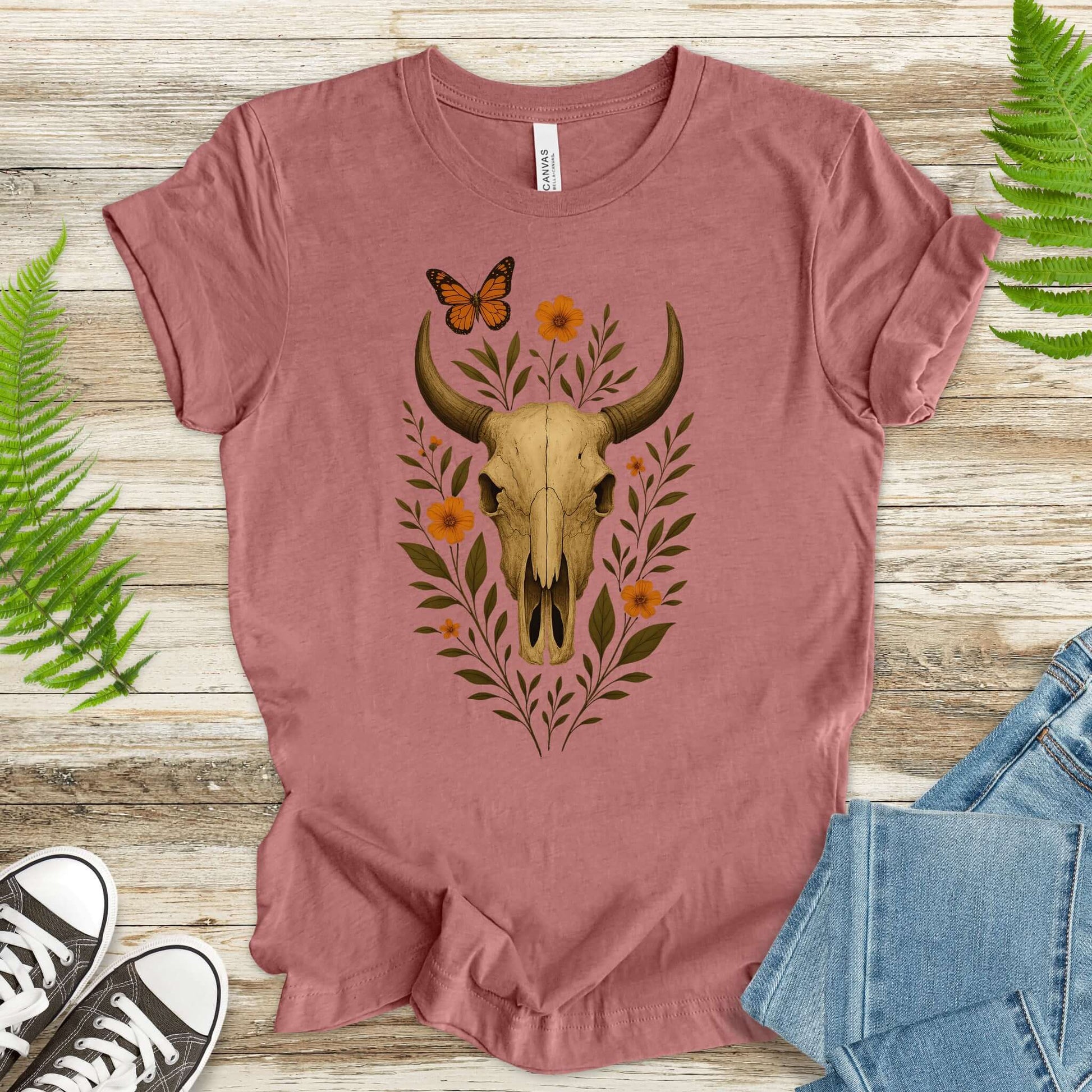 Western Bloom Skull T-Shirt – Floral Bull Skull & Butterfly Tee