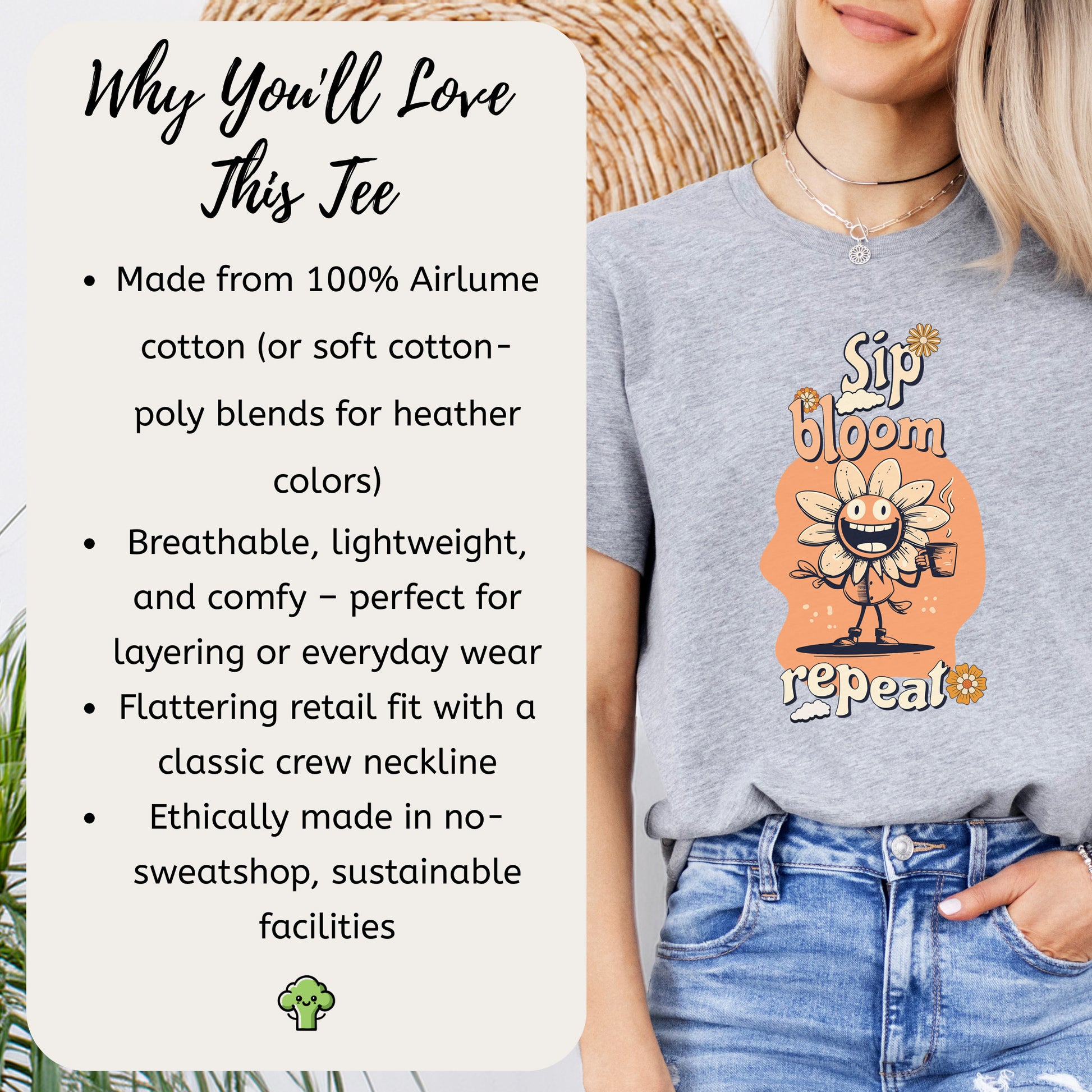 Featuring a cheerful flower enjoying a warm cup of tea, this graphic tee radiates positivity and charm. Perfect for tea lovers, nature enthusiasts, or anyone who loves a touch of whimsy in their wardrobe.