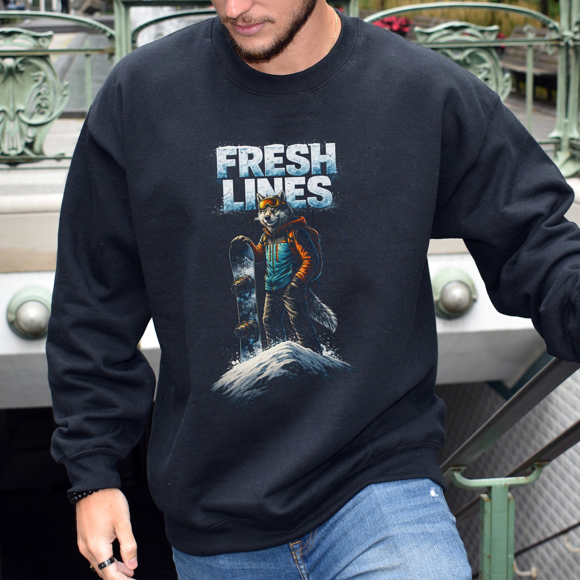 Carve straight into powder-day bliss with this bold “Fresh Lines” sweatshirt, featuring a fearless snowboarding wolf ripping into untouched snow. It’s an epic mix of winter adrenaline, forest mystery, and cozy alpine style—perfect for riders who chase that first clean run of the day.
