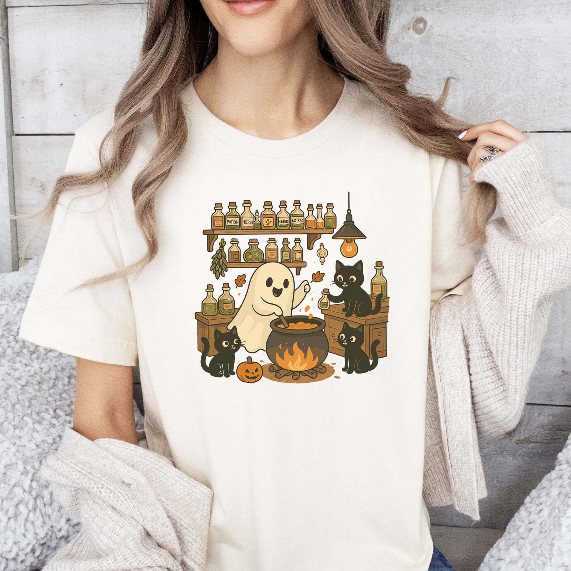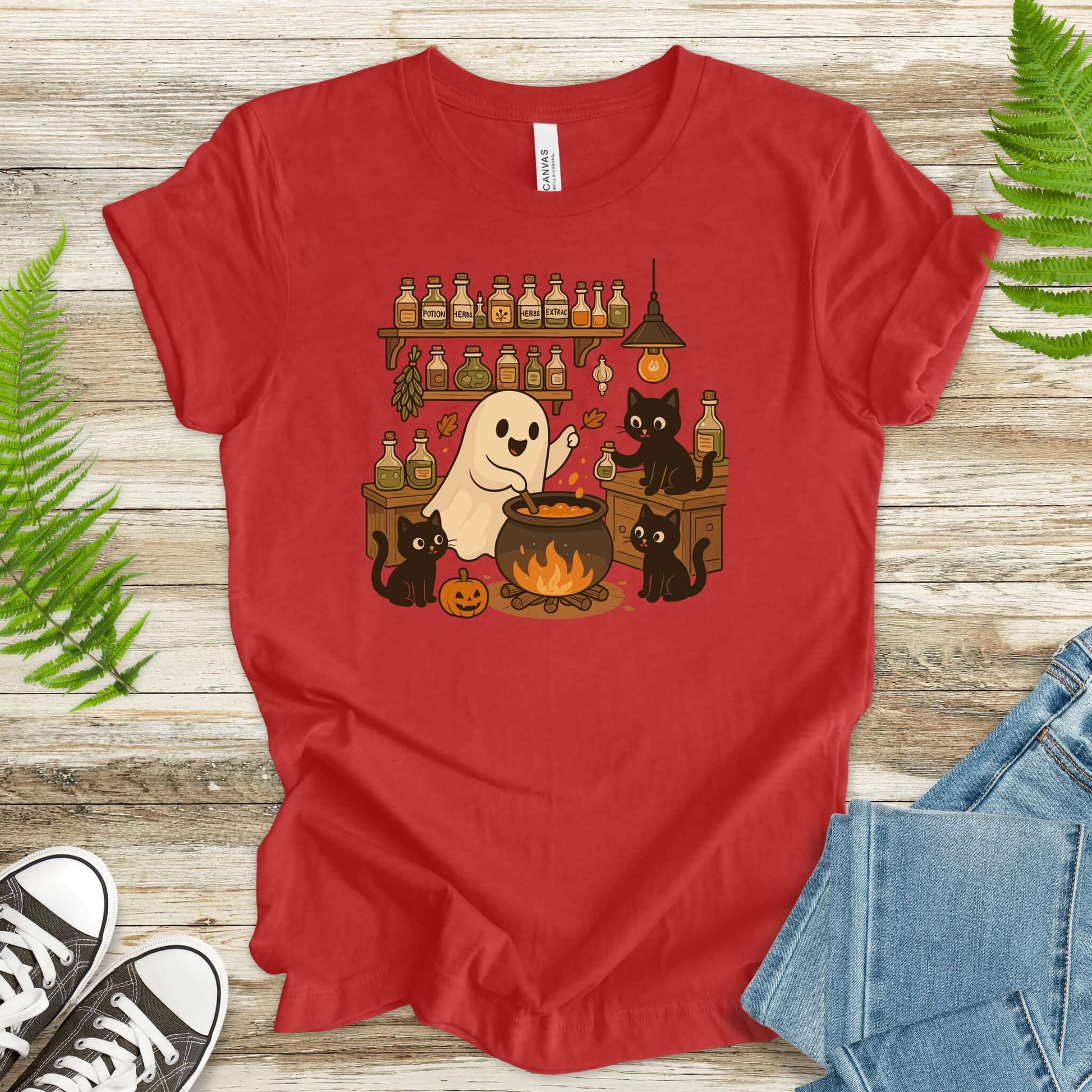 Bubble, bubble, whisker trouble! 🐾🎃 This Ghosts and Black Cats Brewing Magic Halloween T-Shirt is the purr-fect blend of spooky and adorable. Featuring a cheerful ghost and its trio of black cat familiars cooking up cozy chaos in a retro-style potion kitchen, this tee is made for cat moms, ghost fans, and everyone who lives for spooky season with a side of cute.