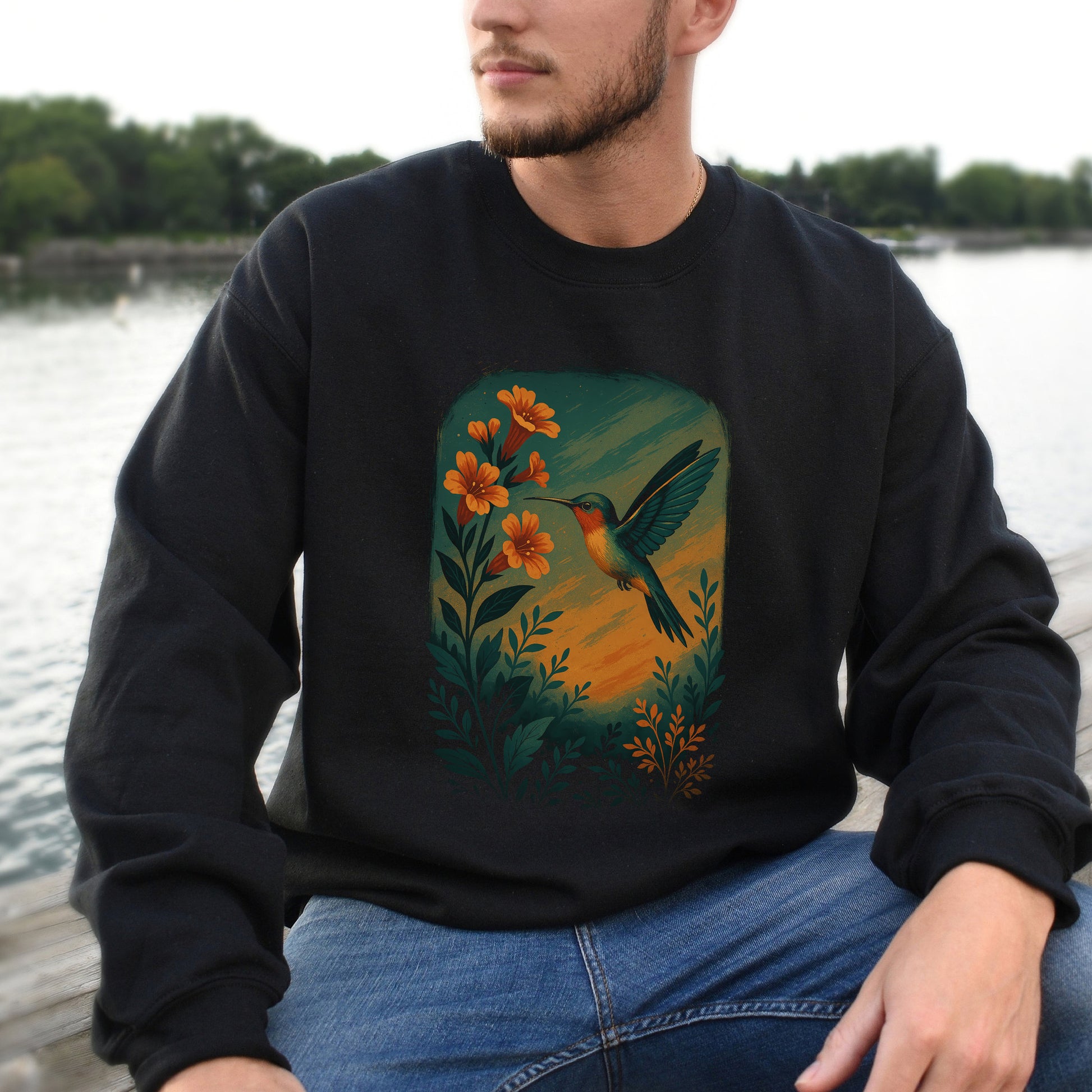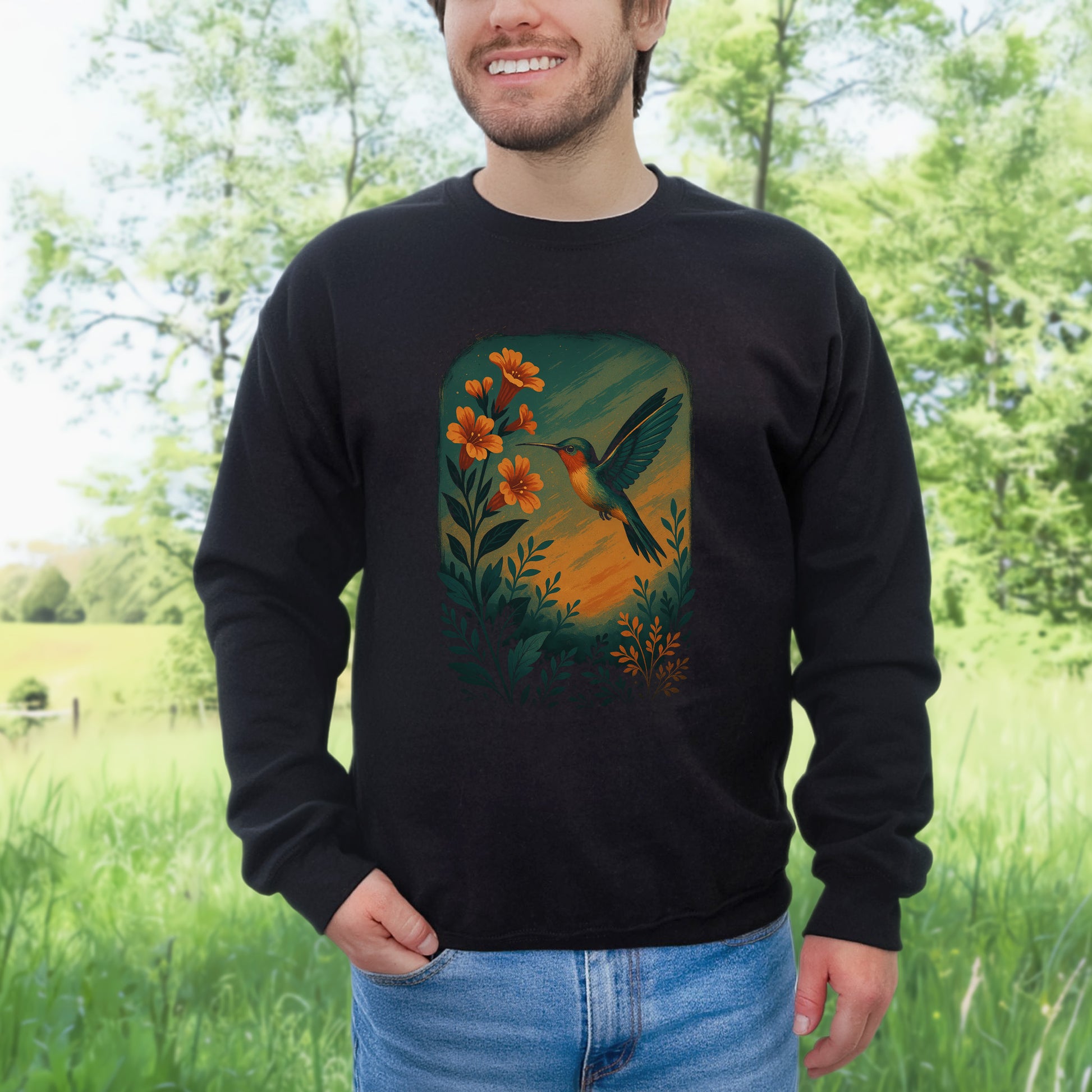 Let joy take flight with this Hummingbird and Flower Sweatshirt, featuring a vibrant hummingbird in mid-hover, surrounded by blooming florals. With soft painterly lines and warm sunset tones, this piece celebrates nature’s tiniest miracle with big-hearted charm.