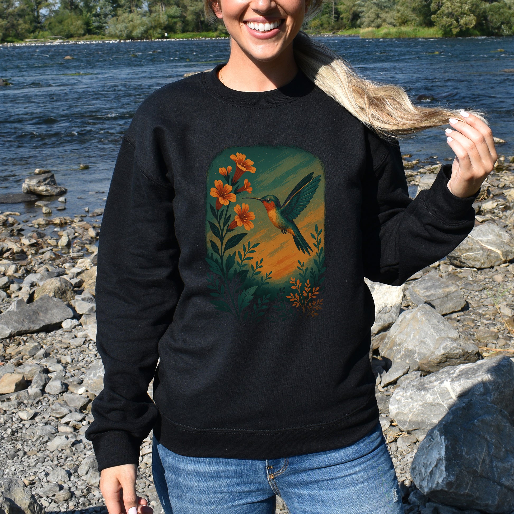 Hummingbird and Flower Sweatshirt – Spirit Animal Symbol of Joy & Lightness
