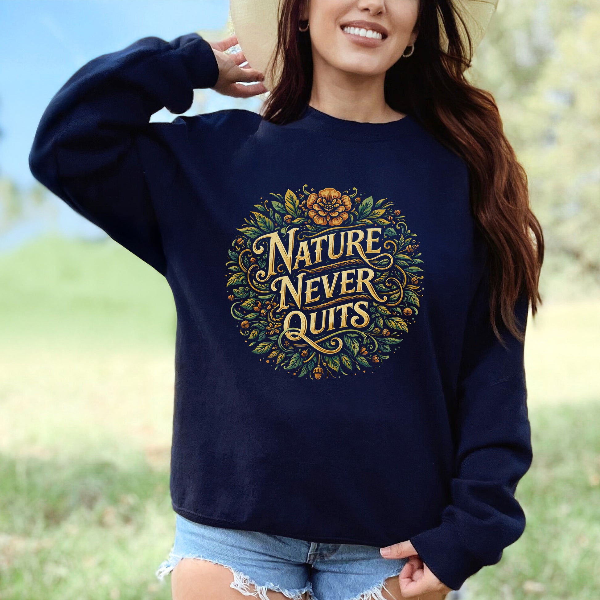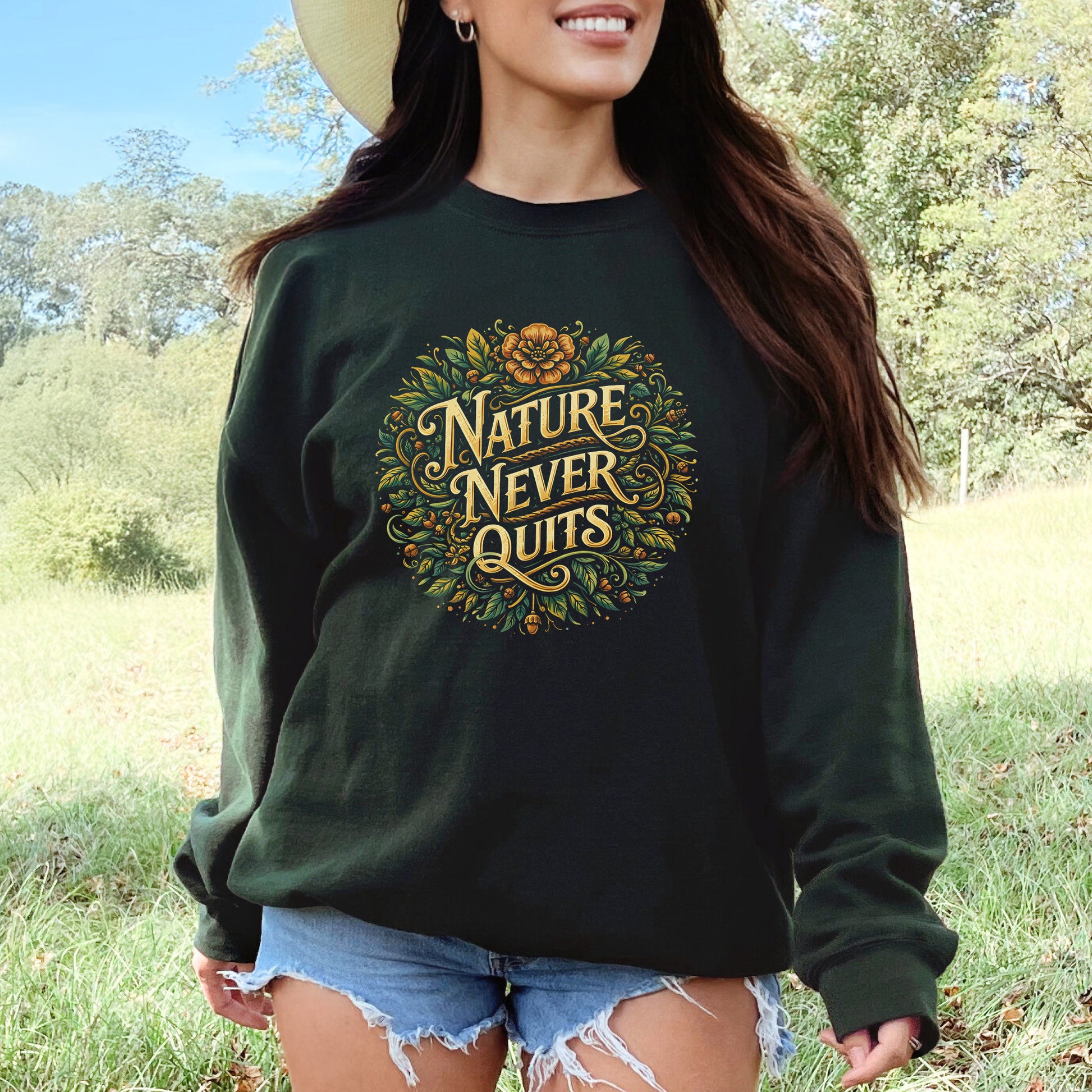 Step into blooming resilience with this enchanting “Nature Never Quits” sweatshirt, where vintage florals swirl with leafy details to honor the unstoppable spirit of the wild. It’s a lush, cozy reminder that growth, beauty, and renewal always find their way through the forest floor.