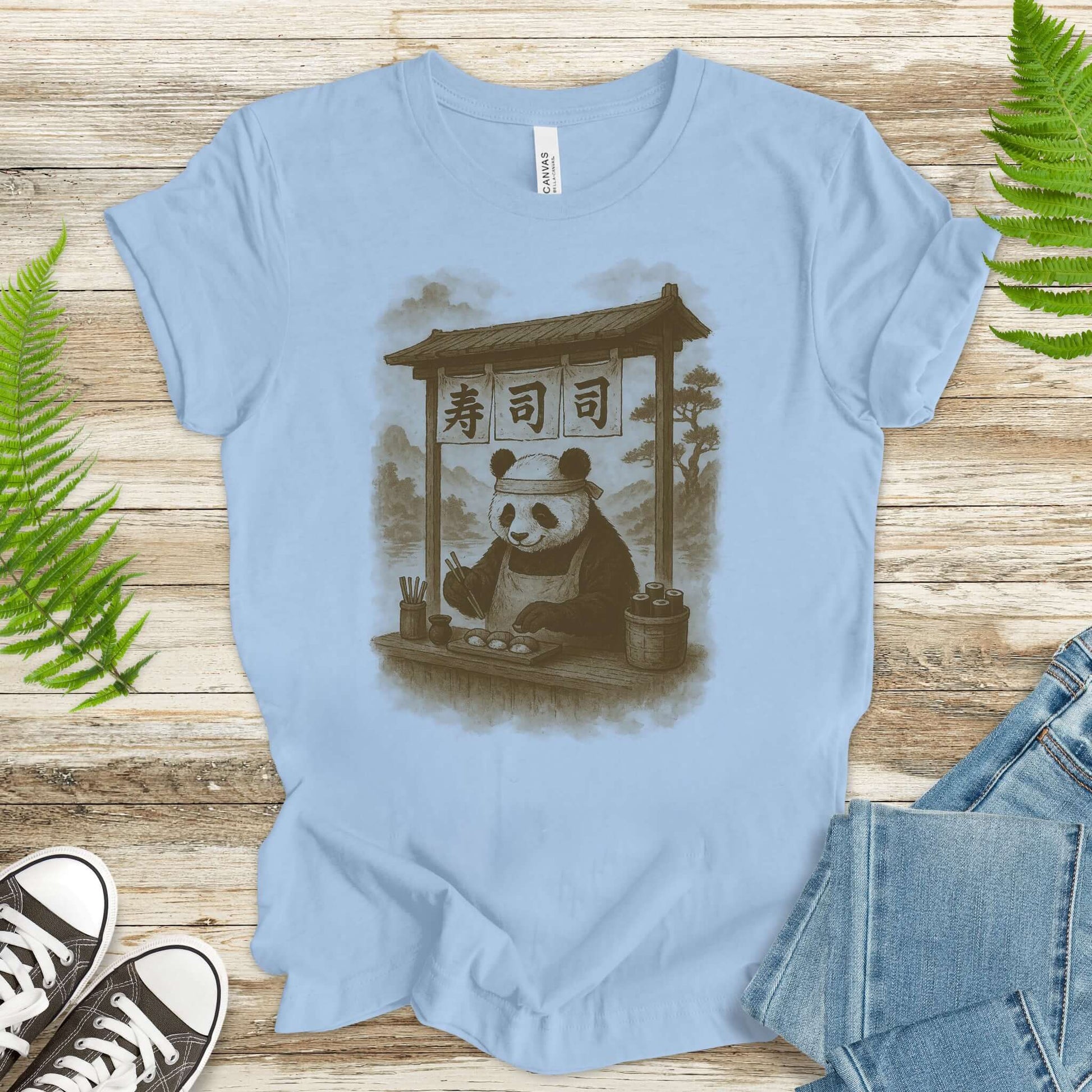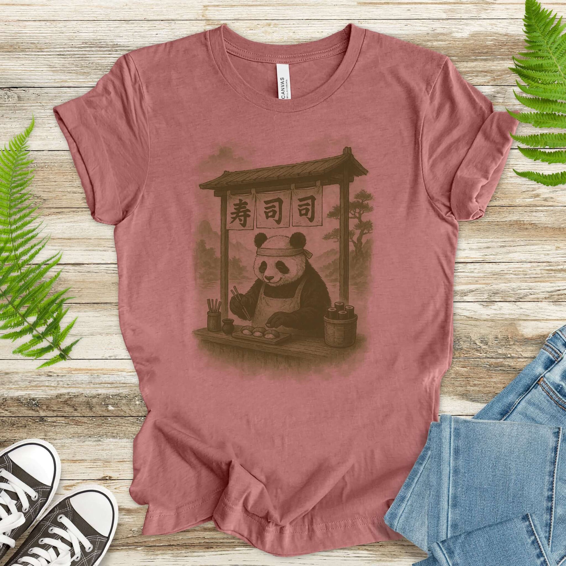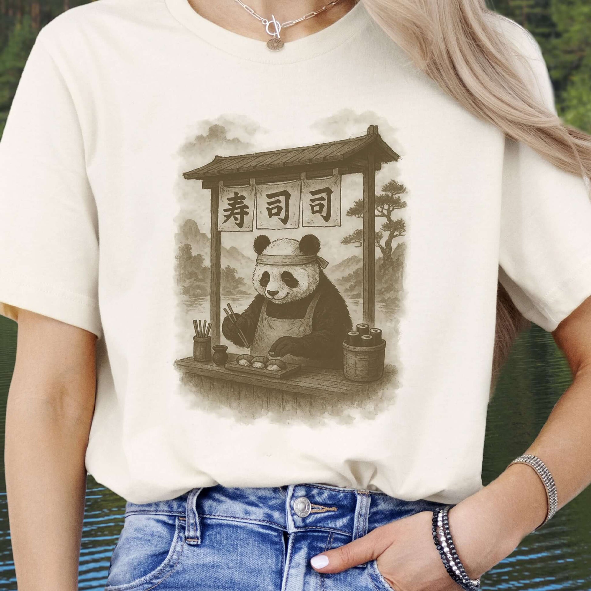 Step into an ancient street market where the panda is the sushi master. Illustrated in the traditional Japanese art style, this design blends quiet charm with whimsical detail—because of course, a serene panda serving sushi under paper lanterns just makes sense.