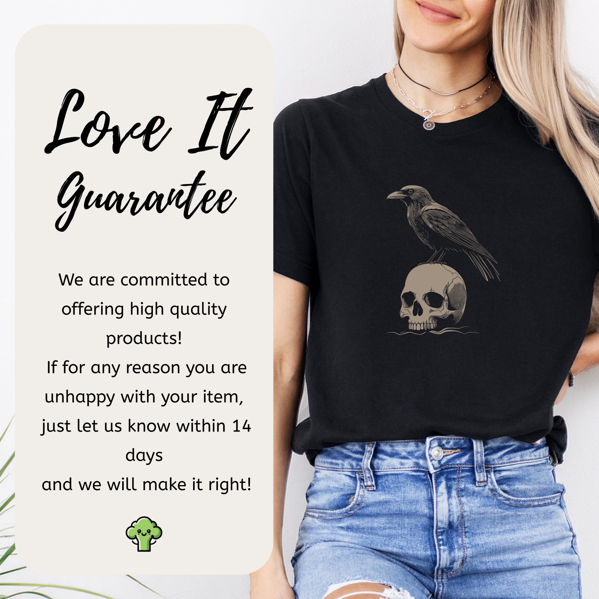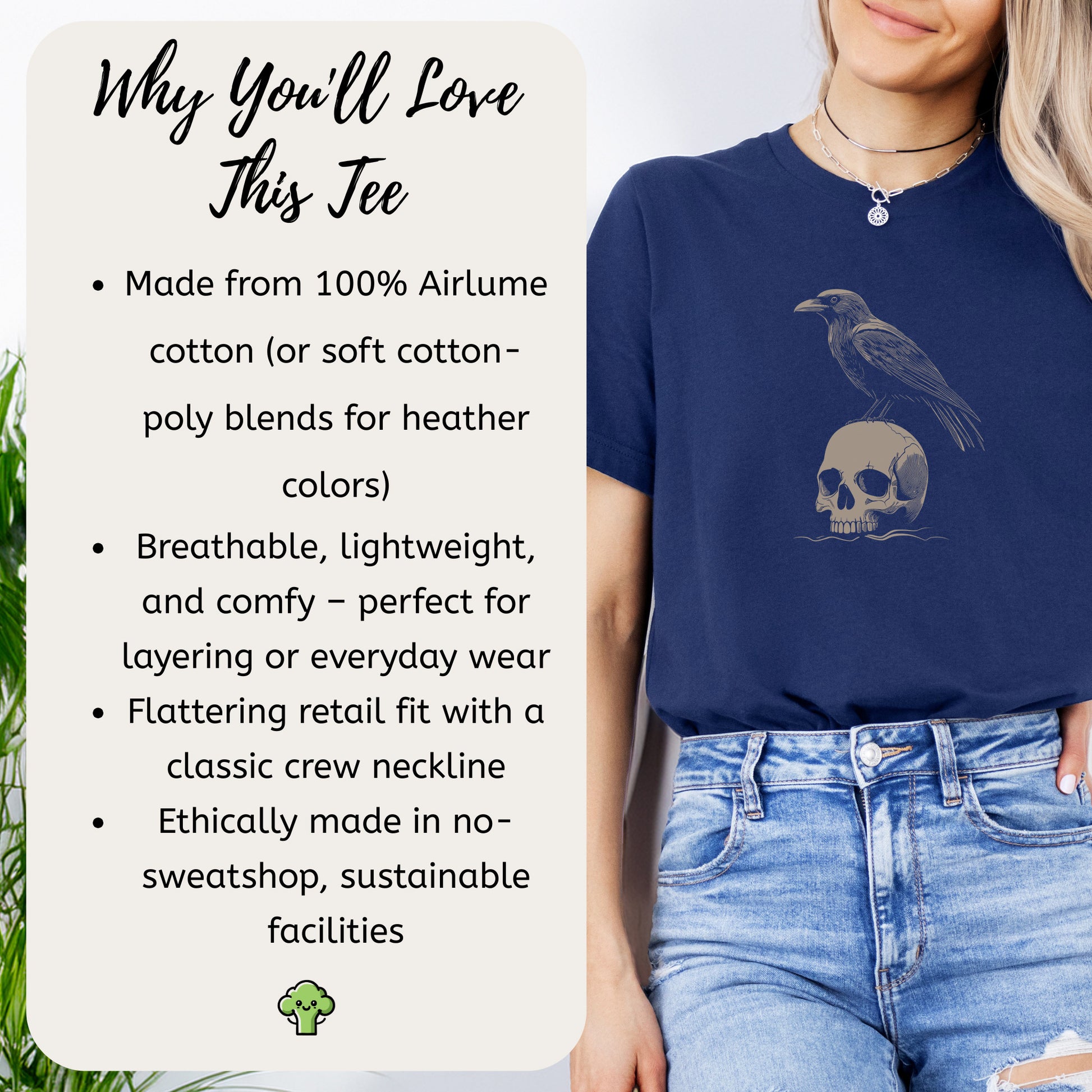 Embrace the mysterious with our Raven on Skull T-Shirt, featuring a stunningly realistic drawing of a raven perched atop a skull.