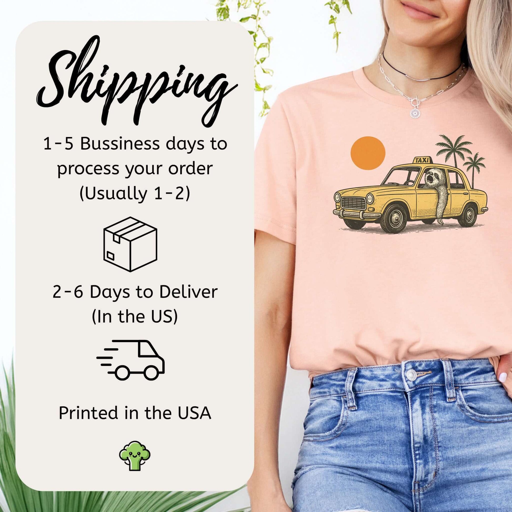 Your ride has arrived… eventually. This funny sloth shirt features a chill sloth driving a bright yellow taxi past palm trees and a glowing orange sunset—bringing total tropical vibes at sloth-approved speeds.