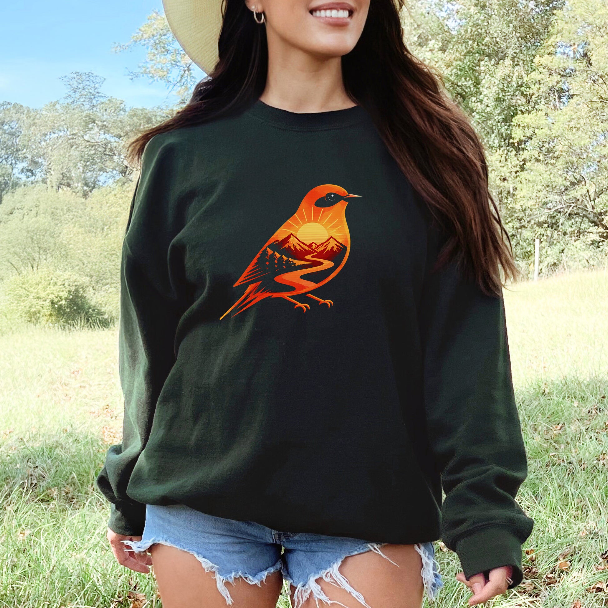 This Sunset Mountain Bird sweatshirt captures the wild freedom of a golden trail moment—where soaring peaks, glowing skies, and an untamed spirit meet. With bold colors and clean lines, this cozy layer brings serious wanderlust energy to your wardrobe.