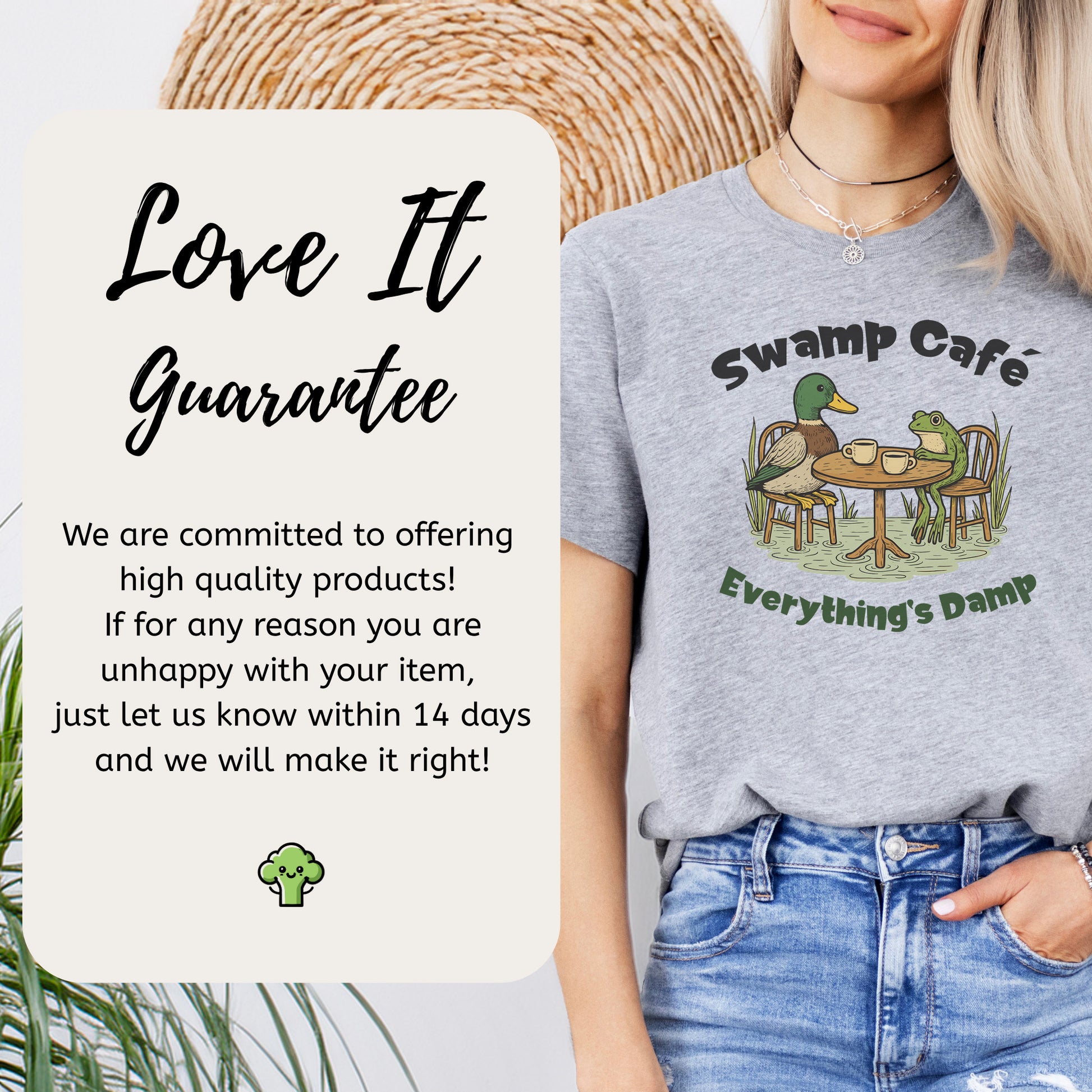 Welcome to the Swamp Café, where the espresso’s hot and everything’s damp. Featuring a dapper duck and an unbothered frog sipping coffee in a soggy wonderland, this shirt’s pure amphibious absurdity.