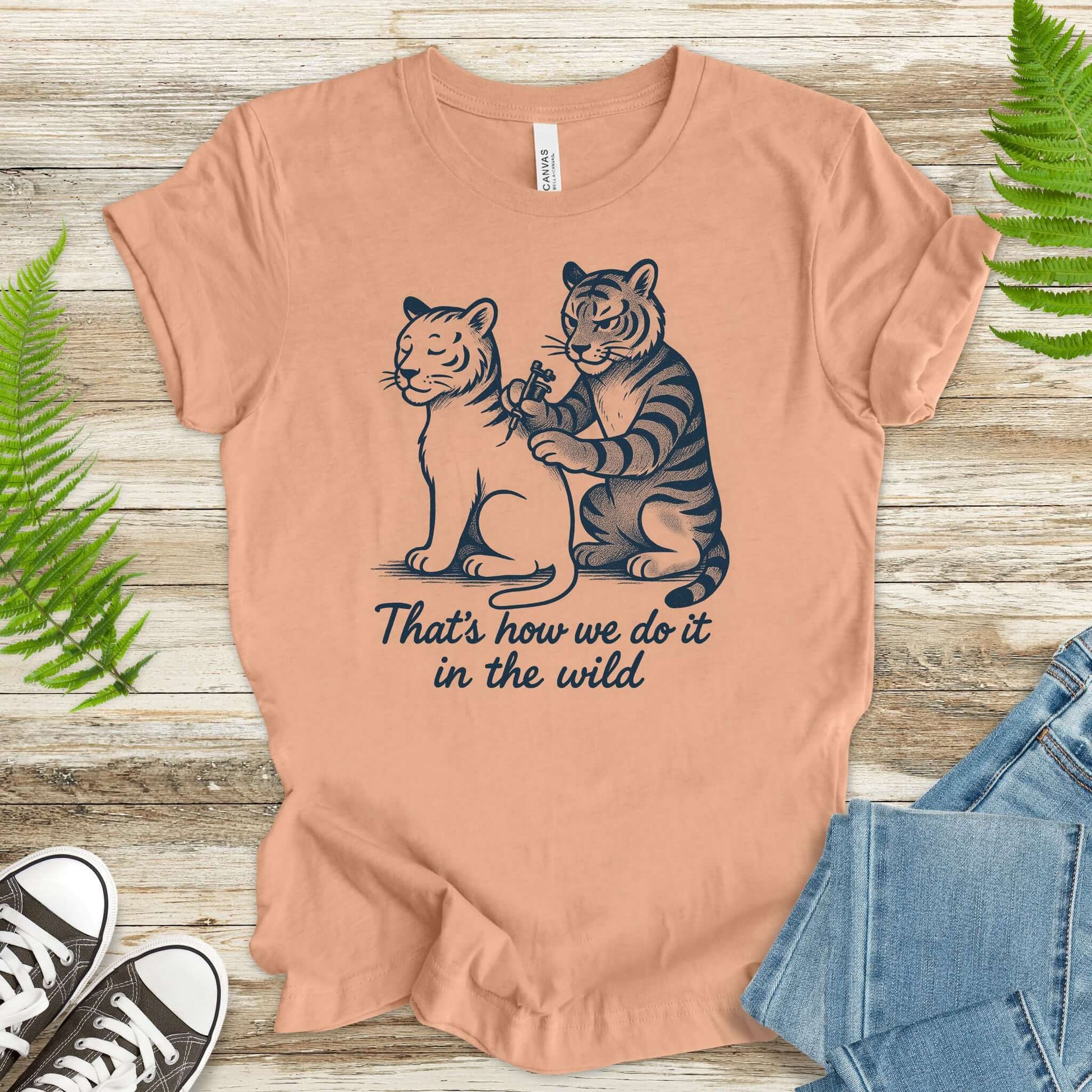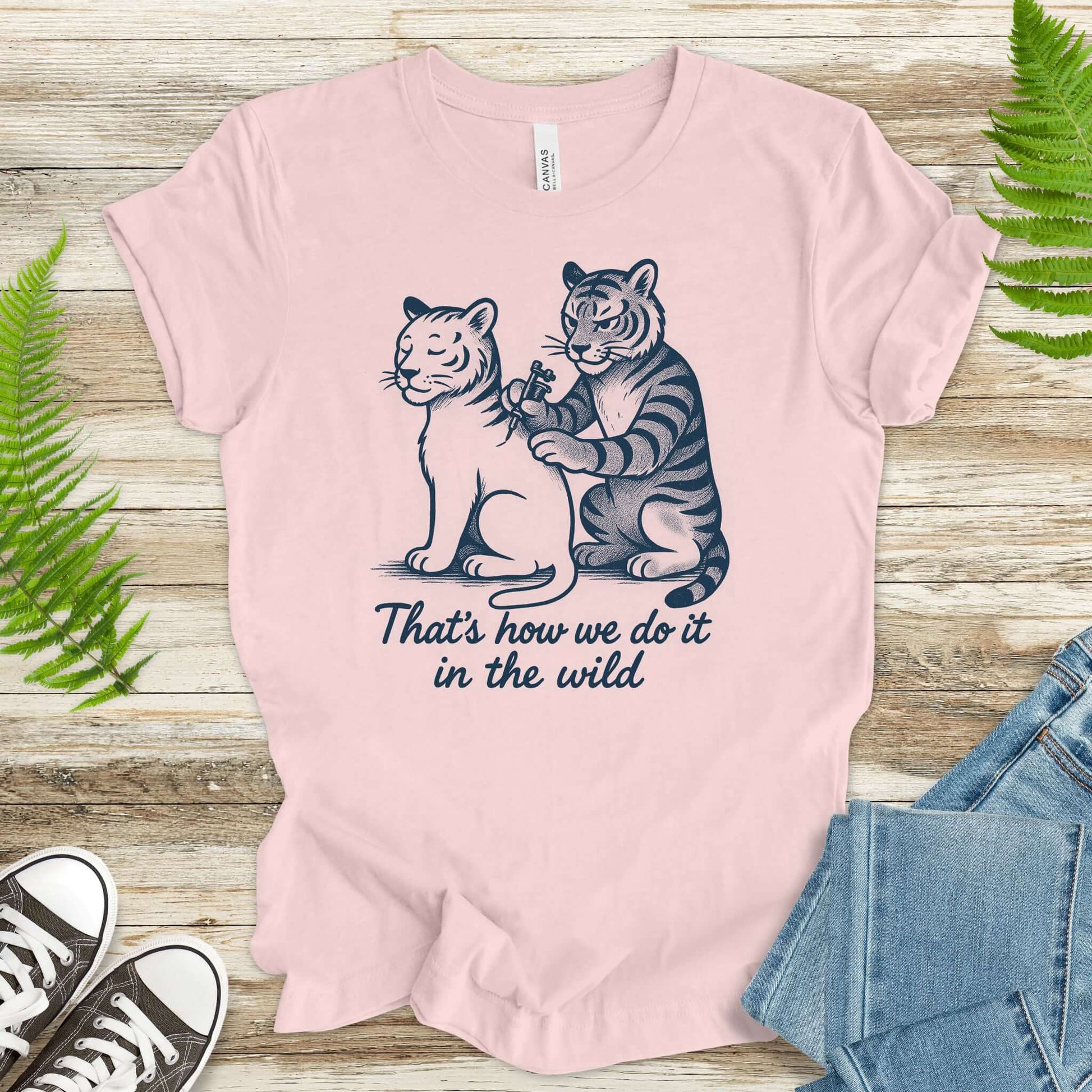 Turns out even tigers need a little help with their stripes. This hilarious design shows one tiger tattooing his friend, complete with the cheeky line “That’s how we do it in the wild.” Perfect for tattoo lovers, big cat fans, and anyone who appreciates clever animal humor.