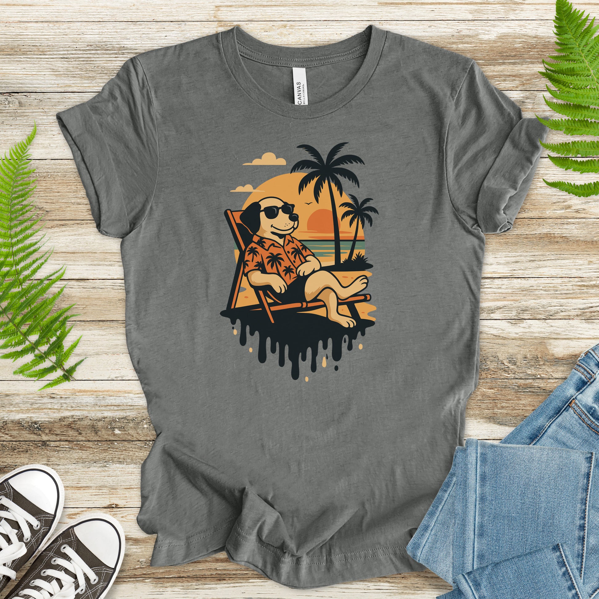 Because even dogs deserve a little R&R. This chill pup is living the dream—Hawaiian shirt, shades on, toes in the sand, and not a care in the world. Against a glowing tropical sunset with a cool spillover design, it’s the ultimate shirt for dog lovers who know how to lounge in style. Wear it to the beach, the backyard, or anywhere you’re serving laid-back summer energy.
