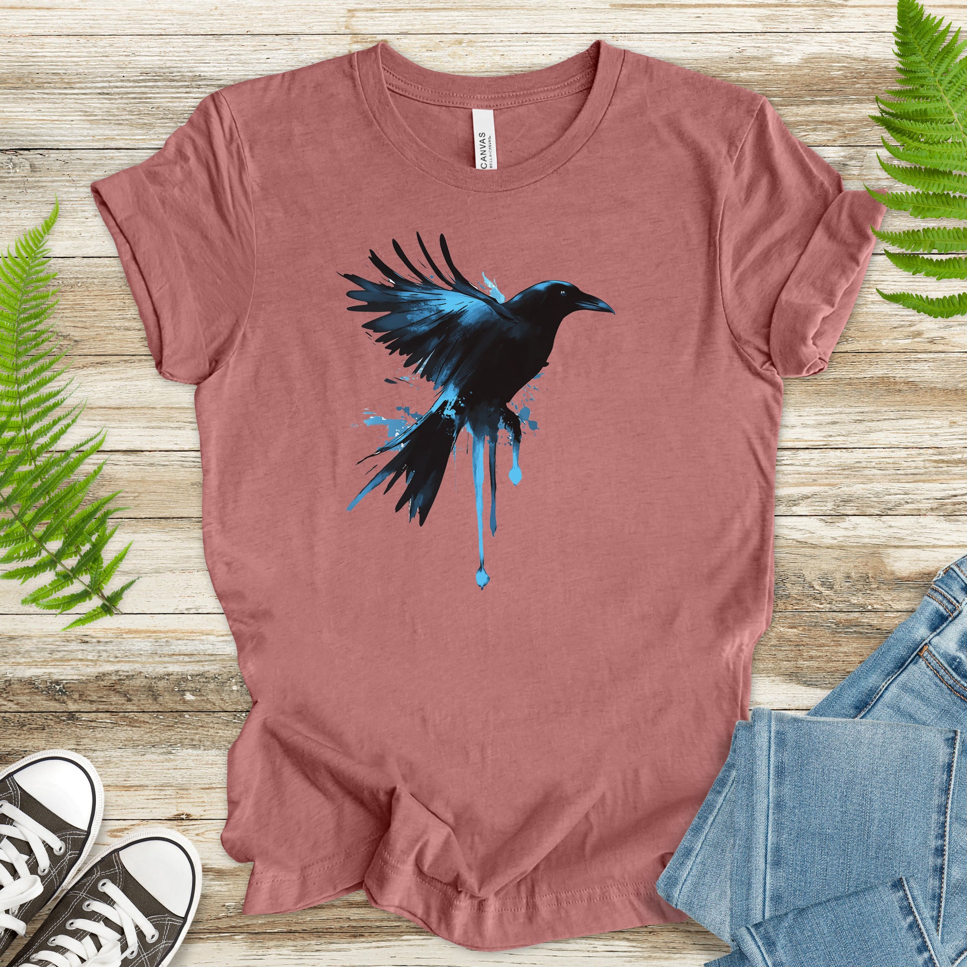 Bold wings, inky shadows, and splashes of electric blue—this watercolor crow bursts with untamed energy. Perfect for raven admirers, midnight thinkers, and anyone who feels at home under moonlit skies. The design blends elegance with mystery, turning your tee into a piece of wearable art that whispers of secrets carried on the wind.