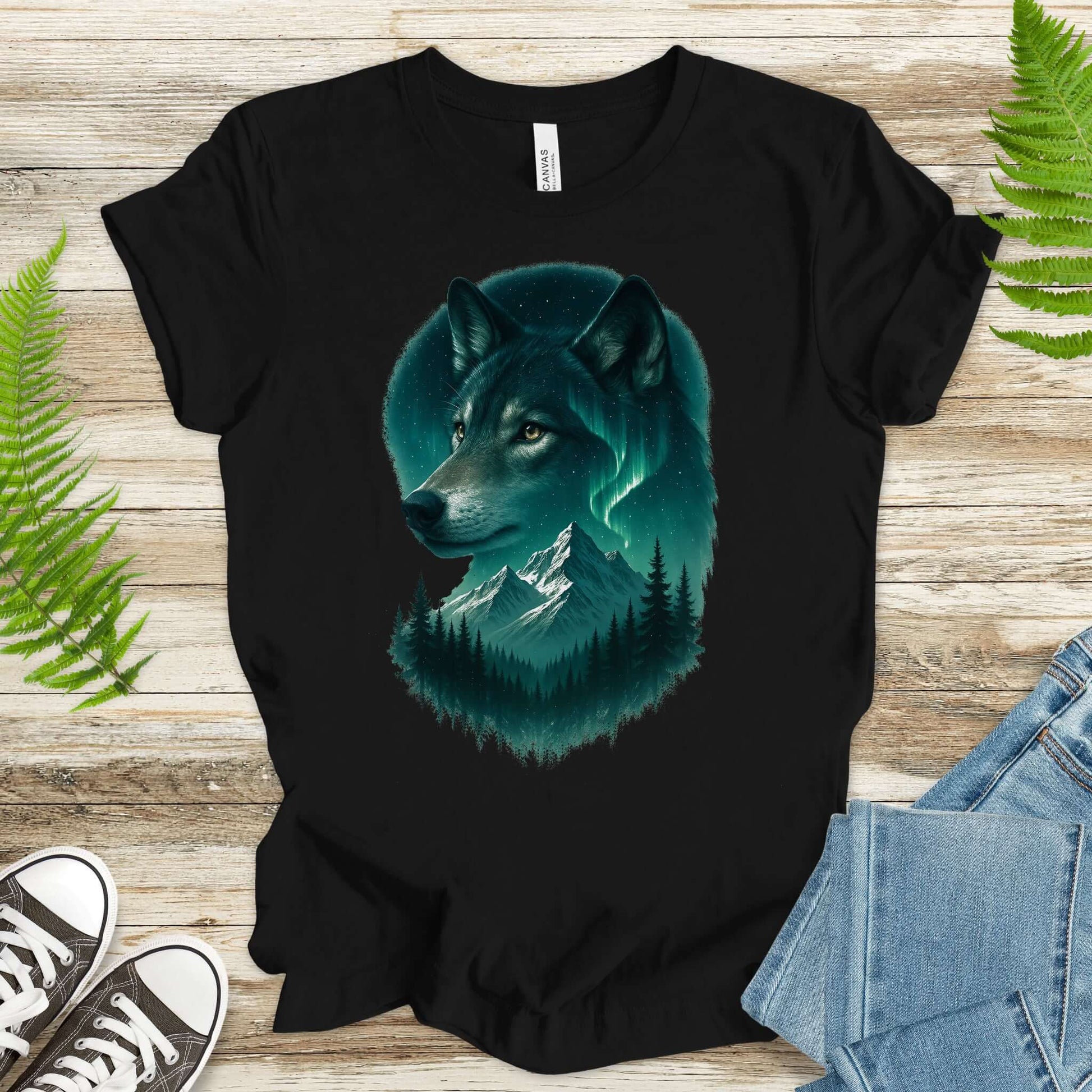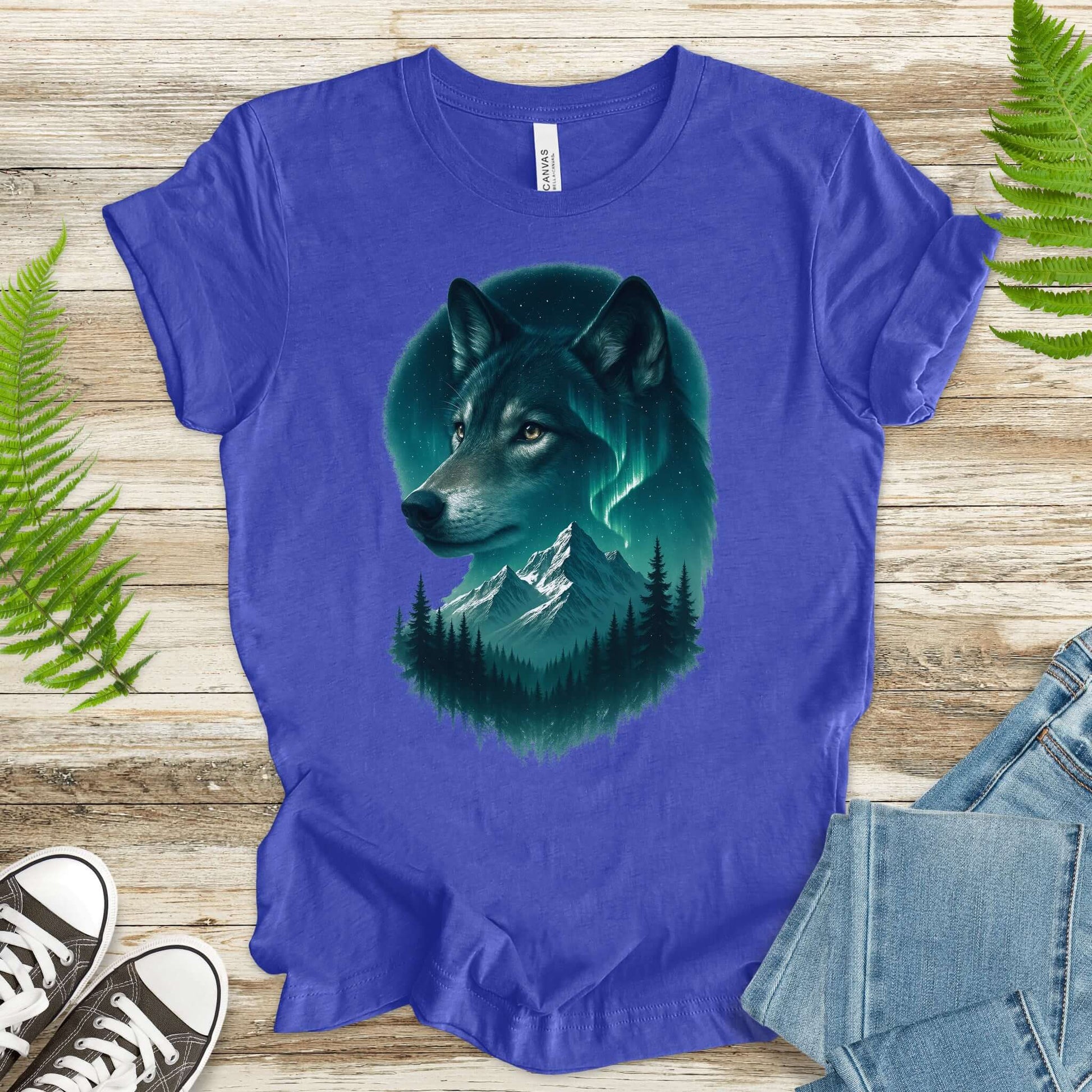 Wolf and Northern Lights T-Shirt – Spirit Animal in Night Forest & Mountain Scene