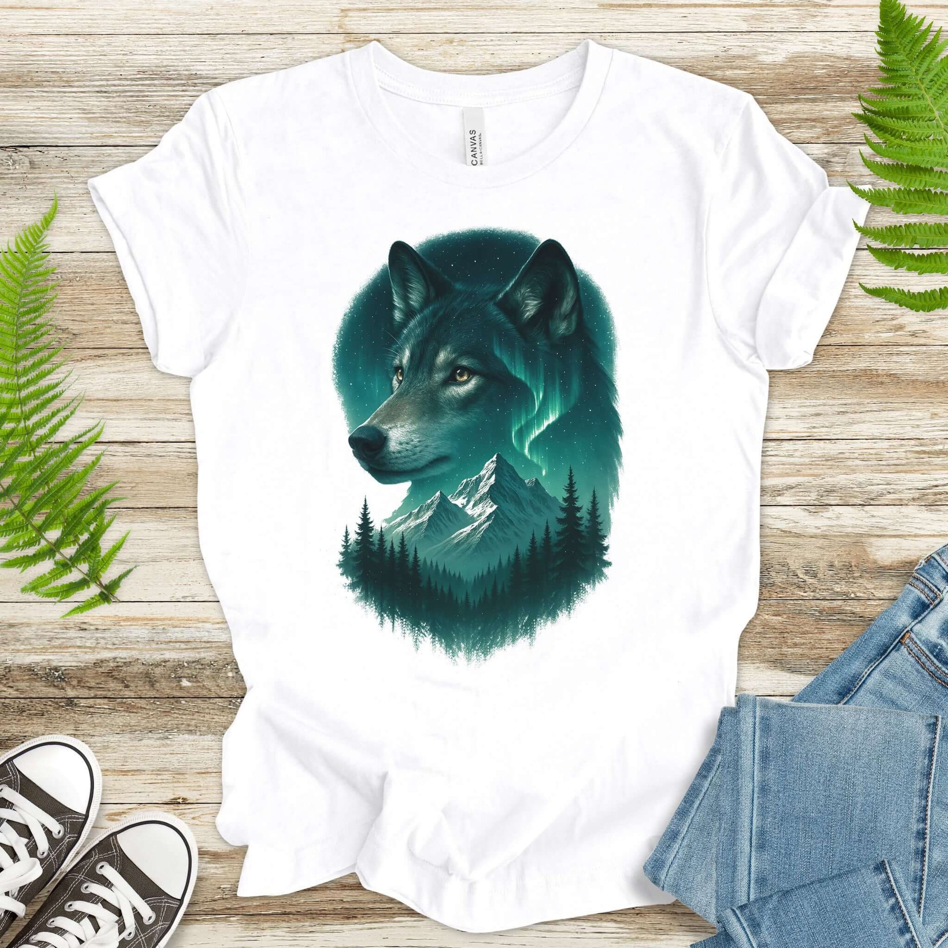 Step into the realm of intuition and wild beauty with this Wolf and Northern Lights T-Shirt. Featuring a detailed wolf portrait blended into a moonlit mountain landscape, pine forest, and glowing aurora borealis, this design captures the mystery and strength of the wolf as a powerful spirit guide.